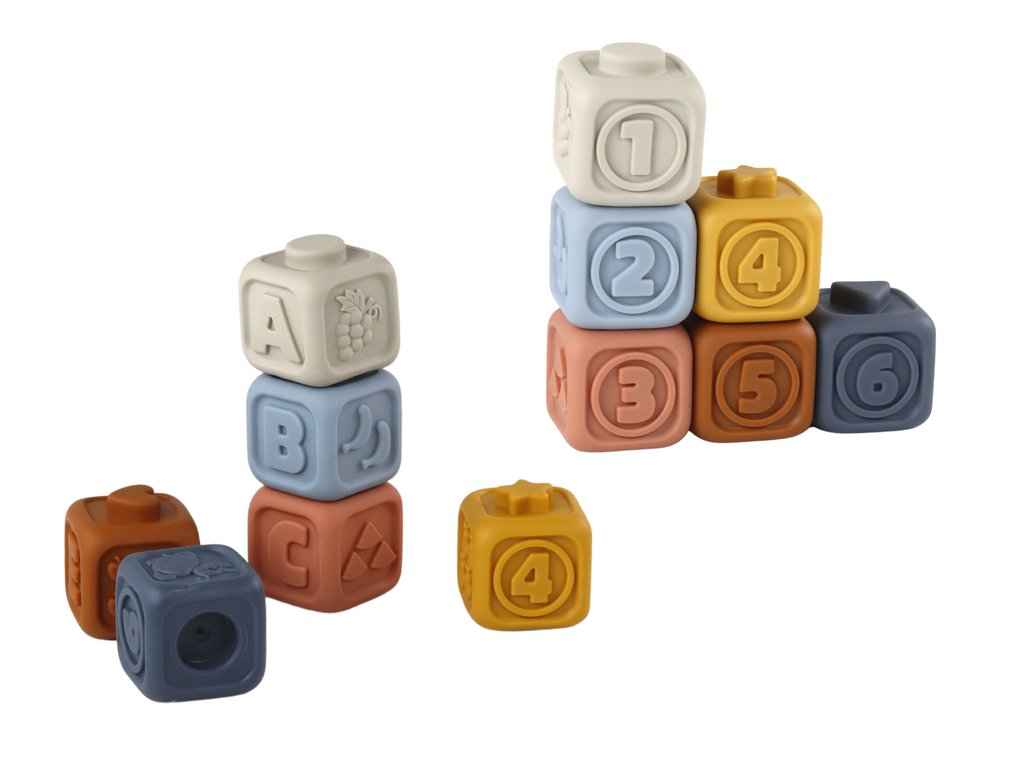 Set vsebuje tudi 6 kock, od katerih ima vsaka izobraževalno funkcijo. Nudijo učne elemente, kot so številke, črke, slike sadja, živali in oblik, in tako postajajo za malčka ne le orodje za igro, temveč tudi zakladnica znanja. Otrok se lahko z njimi igra in hkrati uči osnovnih pojmov, razvija kognitivne veščine ter spodbuja kreativnost.