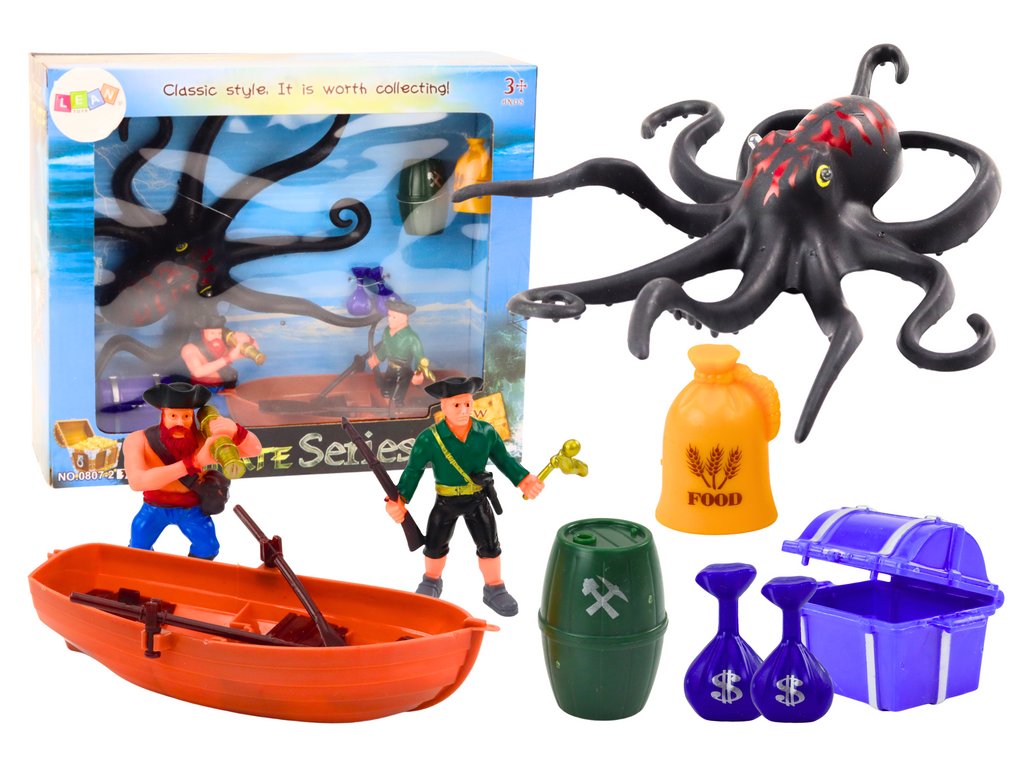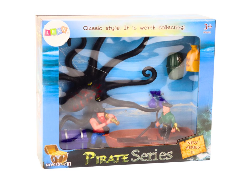 Komplet piratskih figuric je odlična izbira za majhne ljubitelje morskih pustolovščin. V kompletu sta dve figurici piratov, pripravljeni za raziskovanje, majhna ladjica in veličastna hobotnica.