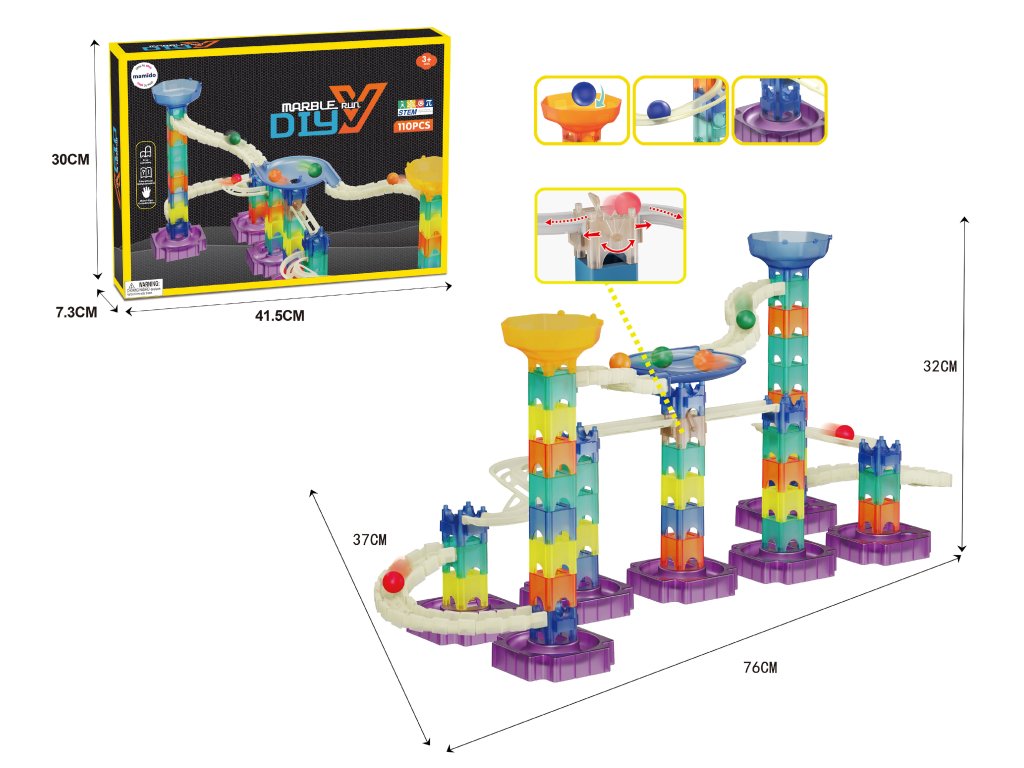Sestavite si lastno pustolovščino z vlakom za kroglice! Ta komplet s 110 deli ponuja nešteto možnosti za sestavljanje zabavnih prog, po katerih se kroglice kotalijo iz ene etaže v drugo. Otroci bodo uživali v napetosti, ustvarjalnosti in veselju igre.