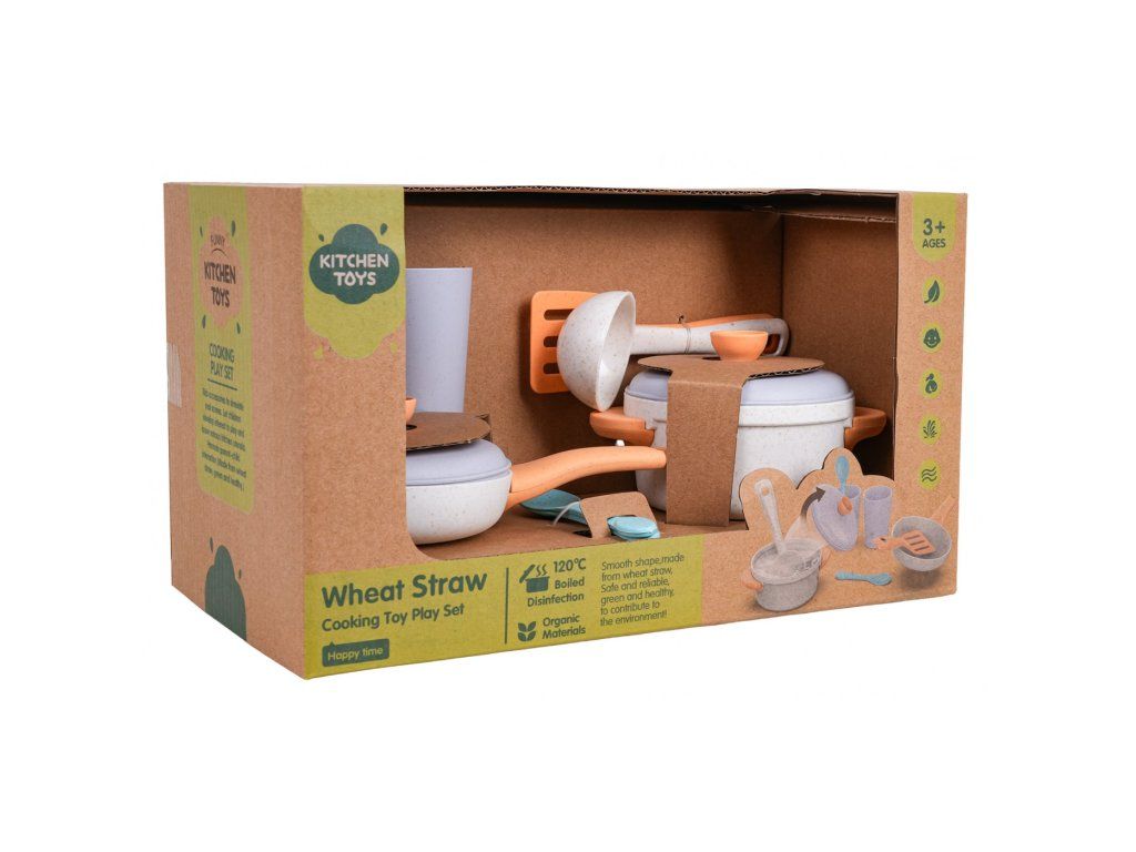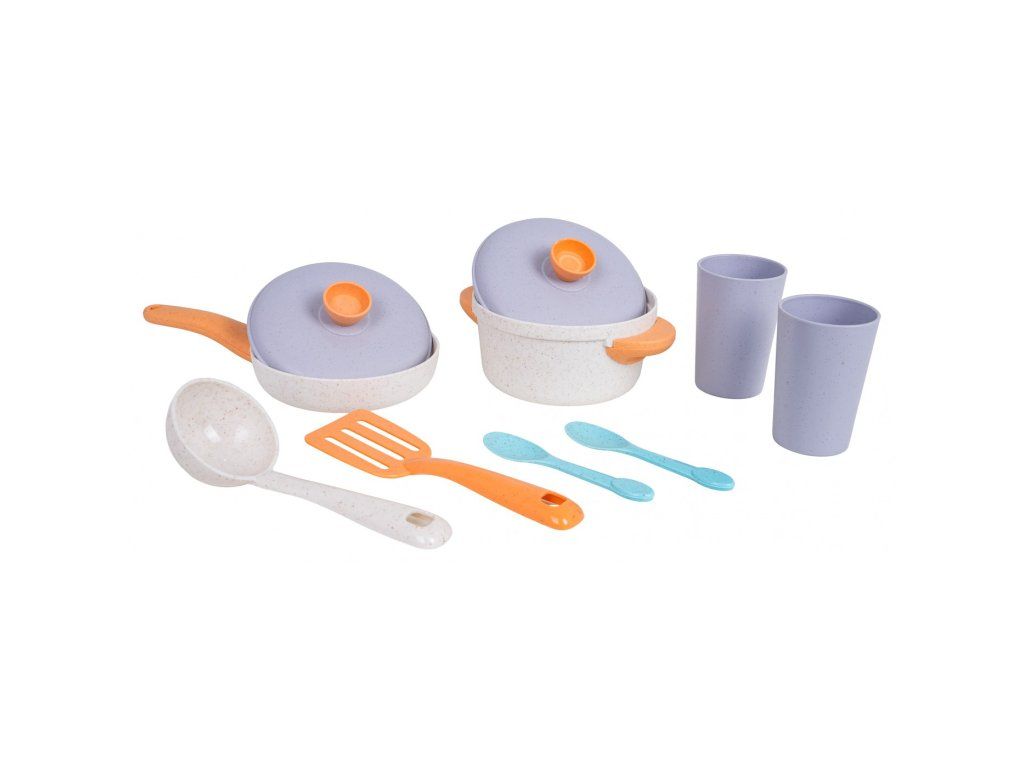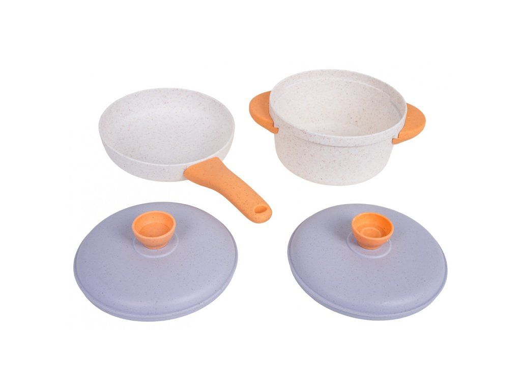 Set lončkov iz bioplastike za otroke, starejše od treh let. Komplet je sestavljen iz 10 kosov. Vključuje ponev s pokrovko, lonec s pokrovko, zajemalko, lopatko, dve žlički in dva kozarčka. Ta komplet ponuja neomejene možnosti igre. Material, iz katerega je komplet izdelan, je prijazen do otrok in okolja. Lahko prenese temperaturo 120 stopinj in je primeren za recikliranje.