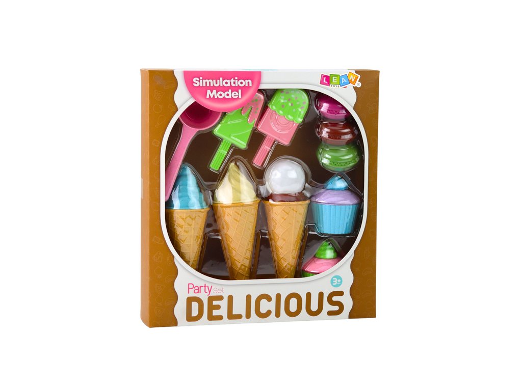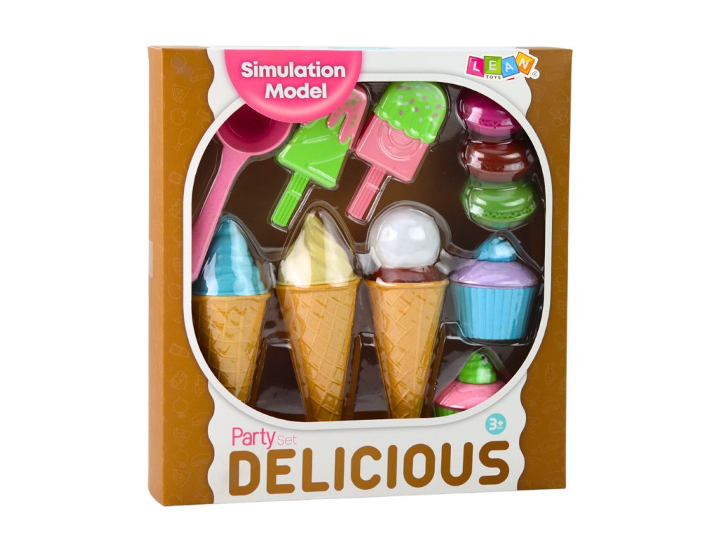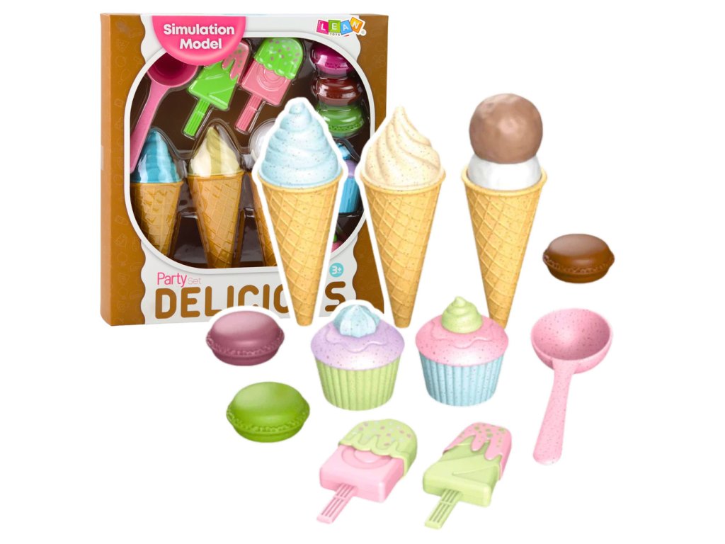 Ta barvit komplet sladoleda in sladkarij je popolna igrača, ki otroke uvede v svet okusnih sladic in ustvarjalne igre vlog. Komplet vključuje različne elemente - kornete za sladoled, sladoled na palčki, kolačke, makrone in žlico za mazanje. Vse je narejeno s pozornostjo do detajlov, da bi čim bolj spominjalo na prave sladice.