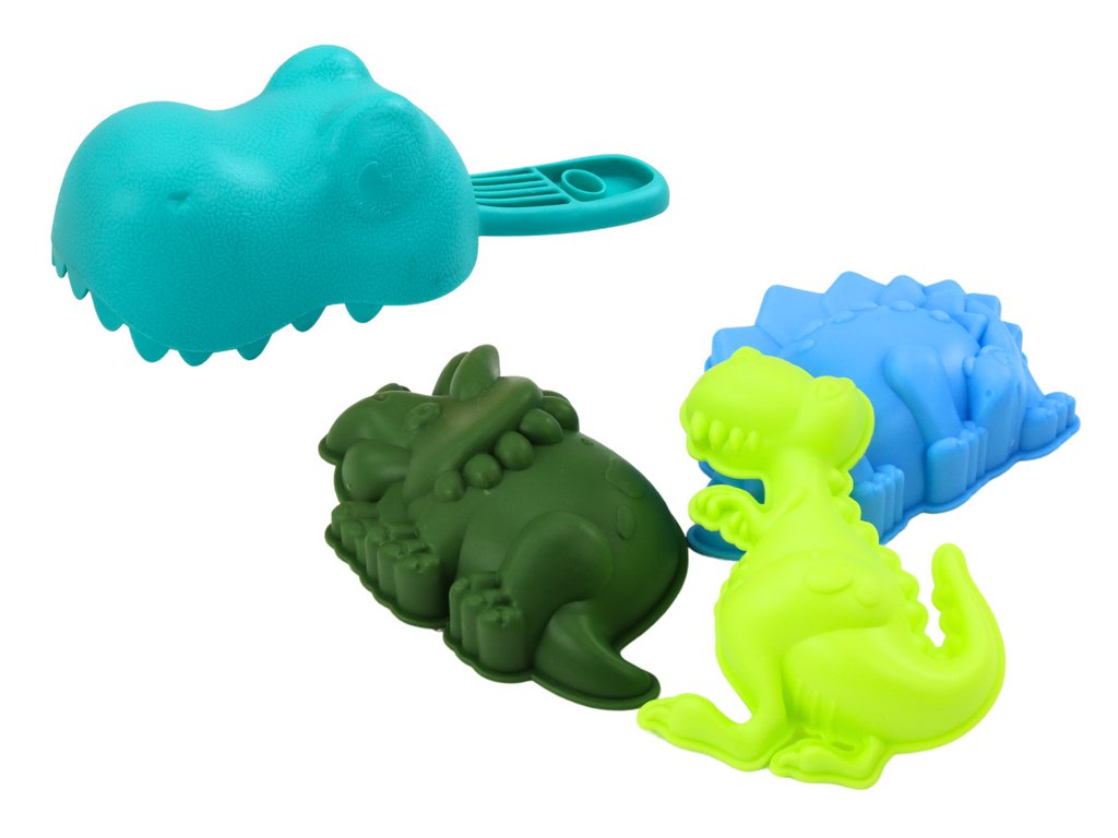 V kompletu so tri barvni modelčki v obliki dinozavrov, ki jih otroci lahko uporabljajo za ustvarjanje peščenih prizorov in pustolovščin s prazgodovinskimi bitji. Ti modelčki dodatno razvijajo otroško domišljijo in bogatijo igro.