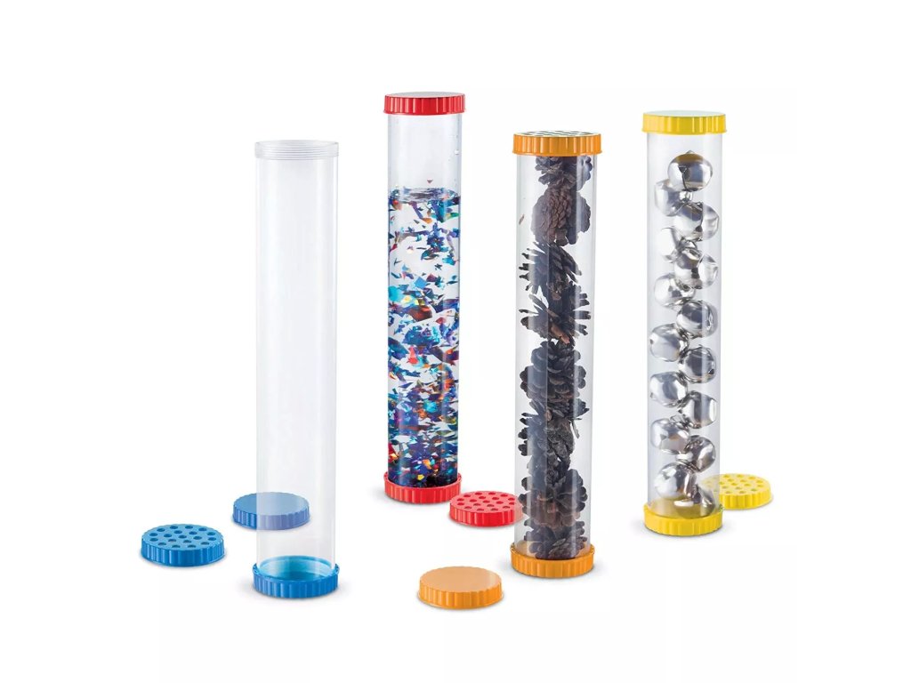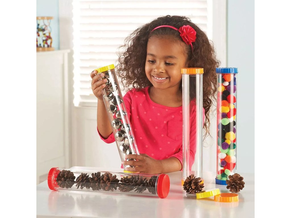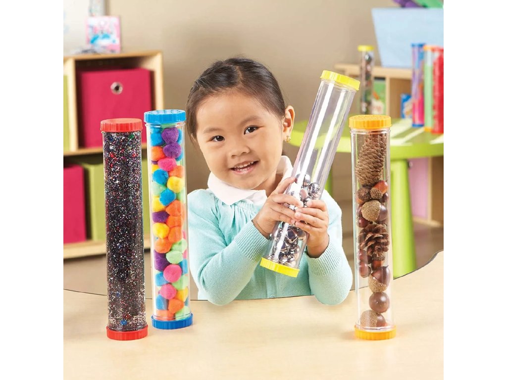Prozorne cevi lahko napolnite z različnimi majhnimi predmeti vsakdanje potrebe, da otroci odkrivajo teksture, barve in zvoke. Tuba ima dvojno odpiranje, je varna in samostojna, kar olajša skupne in samostojne igre.