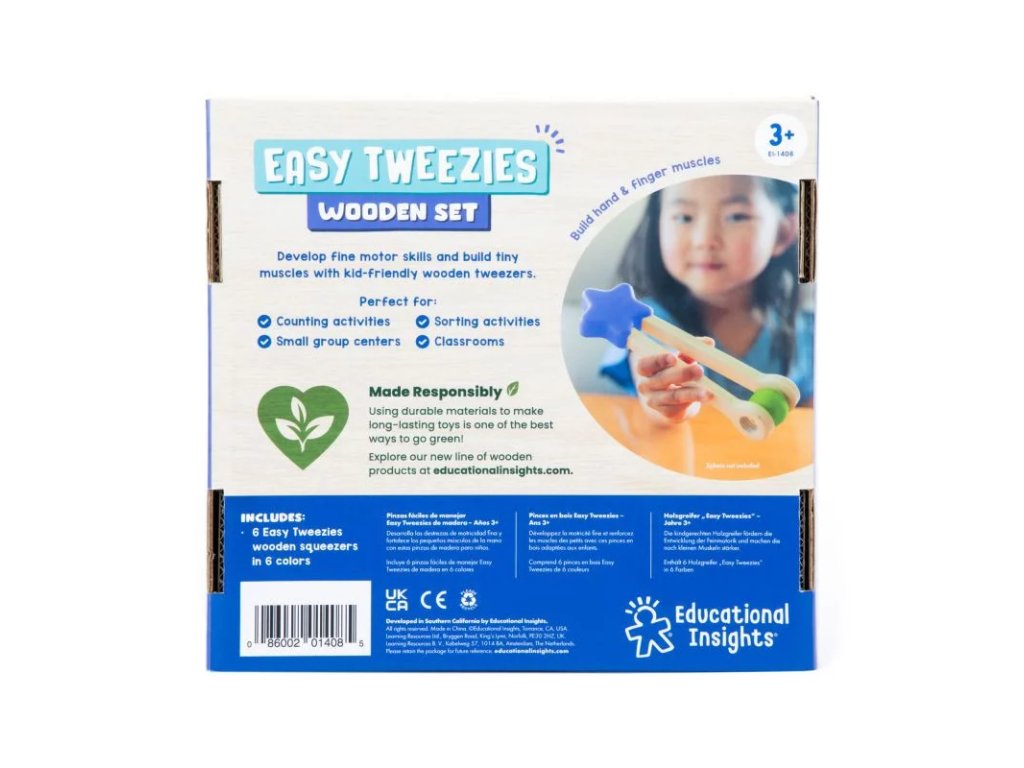 Lesene pincete so primerne za praktične dejavnosti in razvrščanje, tako doma kot v skupini otrok. Komplet vsebuje 6 pincet v različnih barvah. Z uporabo pincet za prijemanje, urejanje ali razvrščanje otroci vadijo drobne mišice v prstih, zapestjih in rokah, ki kasneje pomagajo pri dejavnostih, kot so pisanje, uporaba škarij, zavezovanje čevljev ali oblačenje.