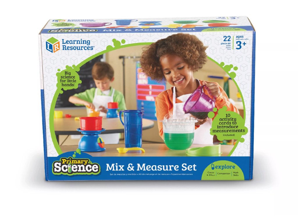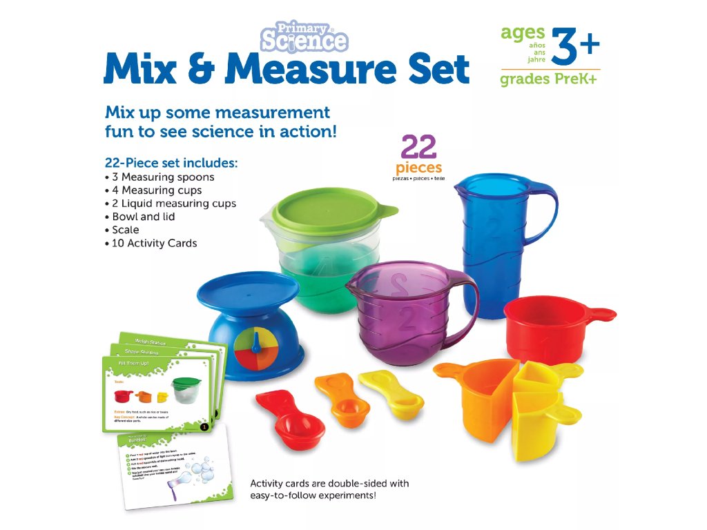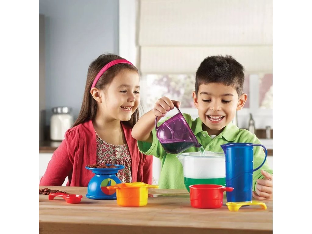 Set vsebuje merilne skodelice različnih velikosti in dodatke, primerne za praktično seznanjanje z merjenjem prostornine in teže. Enostavne aktivnosti spodbujajo samostojno eksperimentiranje pod nadzorom odrasle osebe.