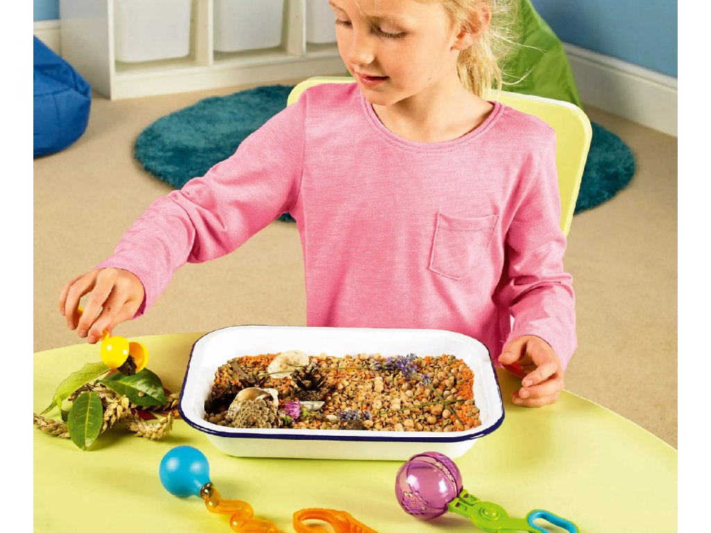 - Pinceta z lopaticami – za zbiranje in stiskanje majhnih predmetov; razvija natančnost prijema med palcem in kazalcem.