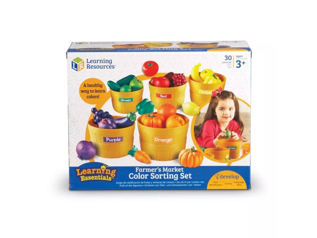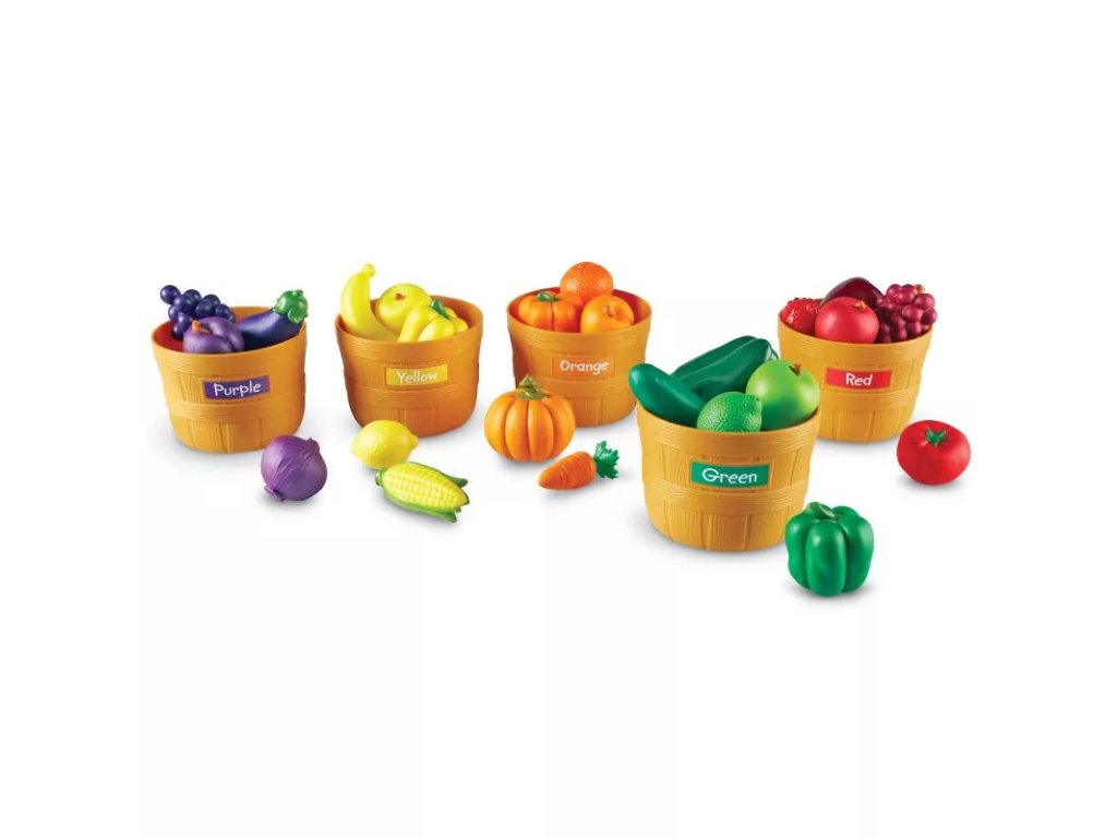 Komplet za razvrščanje barv, ki prihaja iz delavnice britanske izobraževalne znamke Learning Resources. S pomočjo košaric in realističnih izdelkov z relacijsko velikostjo razvija sposobnosti prepoznavanja in razvrščanja barv ter vrst živil.