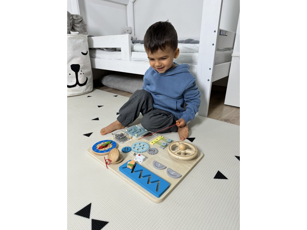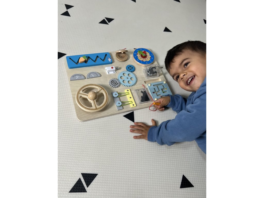 - Številne aktivnosti: Različni elementi na deski, kot so vrteča kolesa, sestavljanke, zadrge in druge, spodbujajo radovednost in razvijajo fino motoriko.