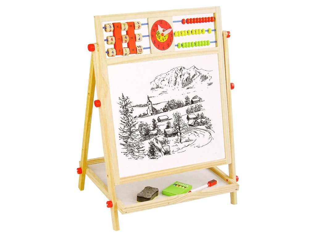 Lesena dvostranska izobraževalna tabla s abakom, uro in abecedo je izjemno orodje za razvoj najmlajših. Narejena iz trdnega lesa zagotavlja vzdržljivost in varnost med igro. Zaradi vrtljive zasnove omogoča uporabo dveh različnih površin: ene s črnim materialom, idealne za risanje s kredo, in druge bele, primerne za risanje s flomastri.