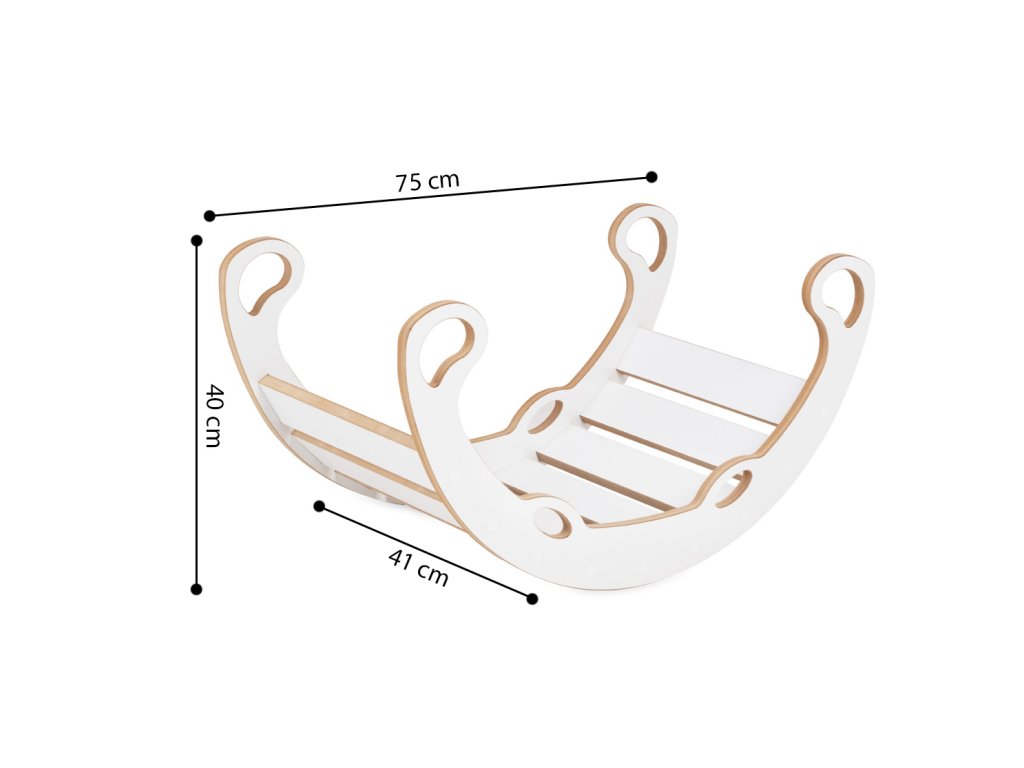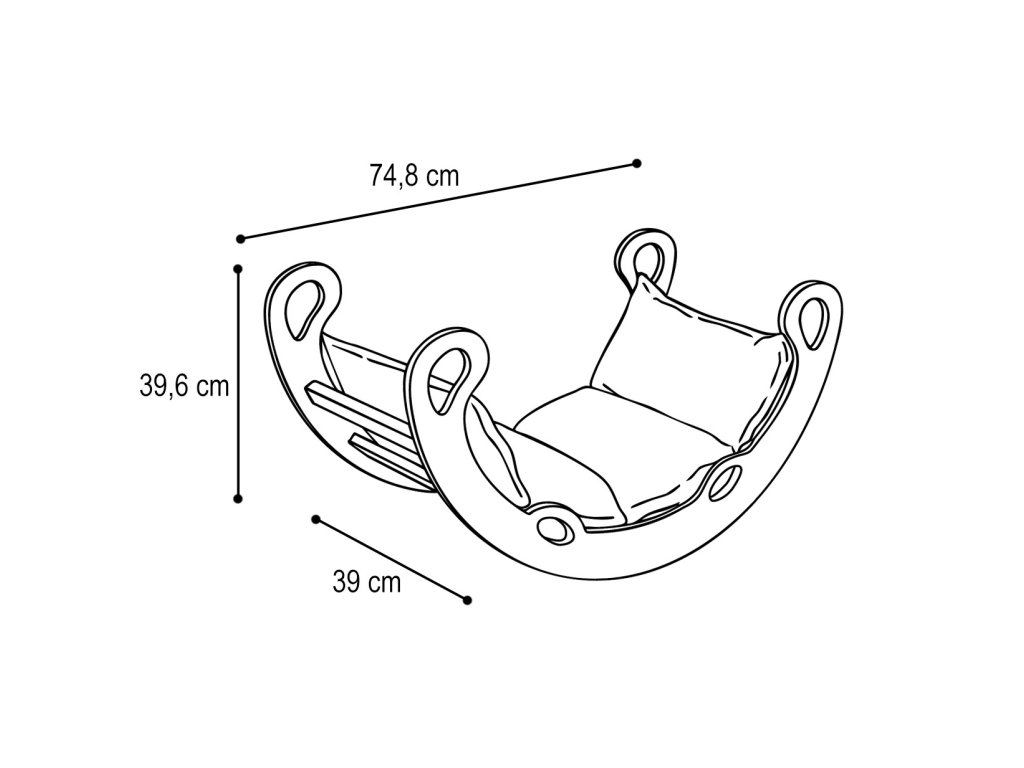 Gugalnica je izdelana iz kakovostne MDF plošče — materiala, ki je trpežen, gladek in varen za otroke. Vsi robovi so skrbno zaobljeni in obrušeni, del pa je tudi udobna mehka blazina, zaradi katere je vsako guganje resnično veselje. Gugalnico preprosto obrnite navzven in spremeni se v trdno lestev, idealno za male raziskovalce in plezalce. Takšna uporaba spodbuja otroka k gibalnim aktivnostim in samostojni igri.