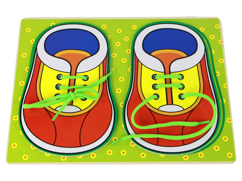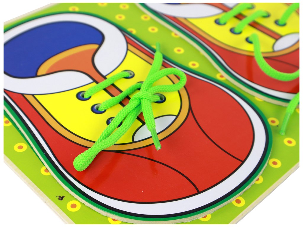 V kompletu boste našli zeleno leseno desko z dimenzijami 30 cm x 22 cm x 0,5 cm. Ta deska ni le estetska, ampak tudi funkcionalna. Vključuje 2 leseni pisani čevlji z zelenimi vezalkami, ki pritegnejo pozornost otroka. Otrok bo imel priložnost vaditi zavezovanje vezalk, s čimer uri svojo ročno spretnost.