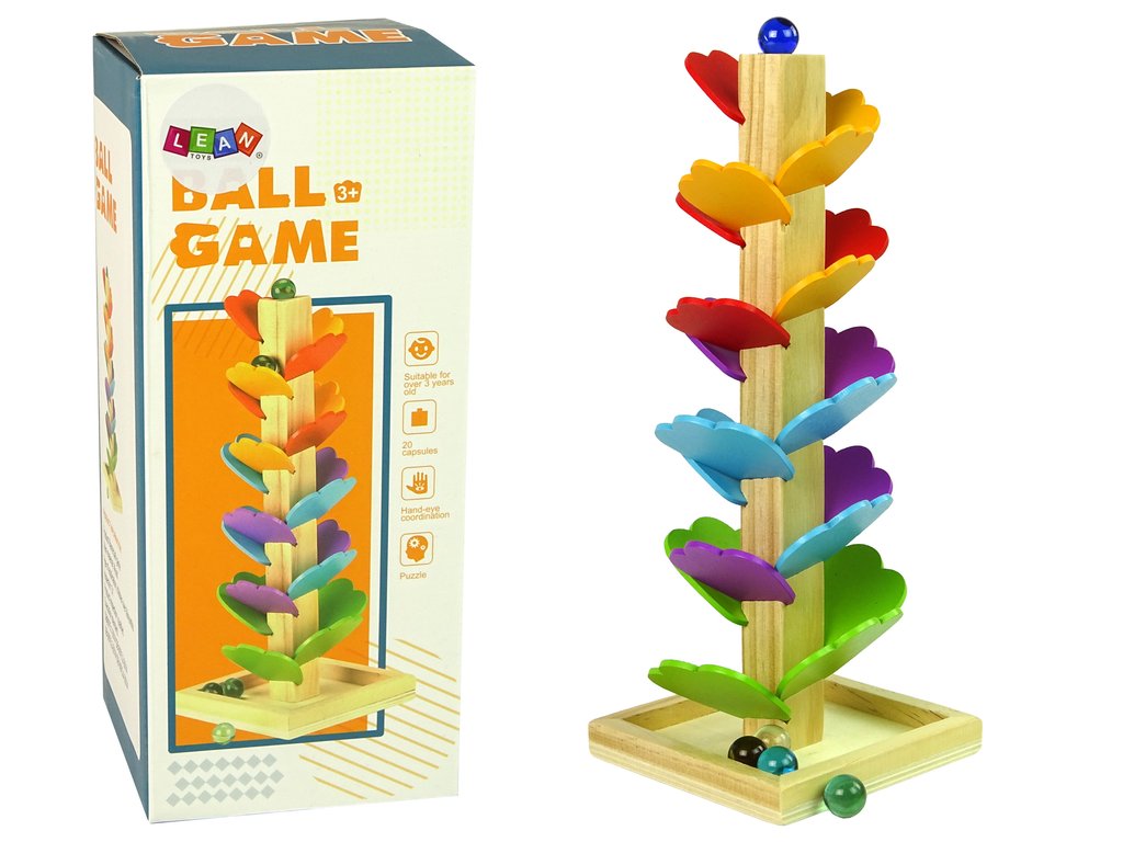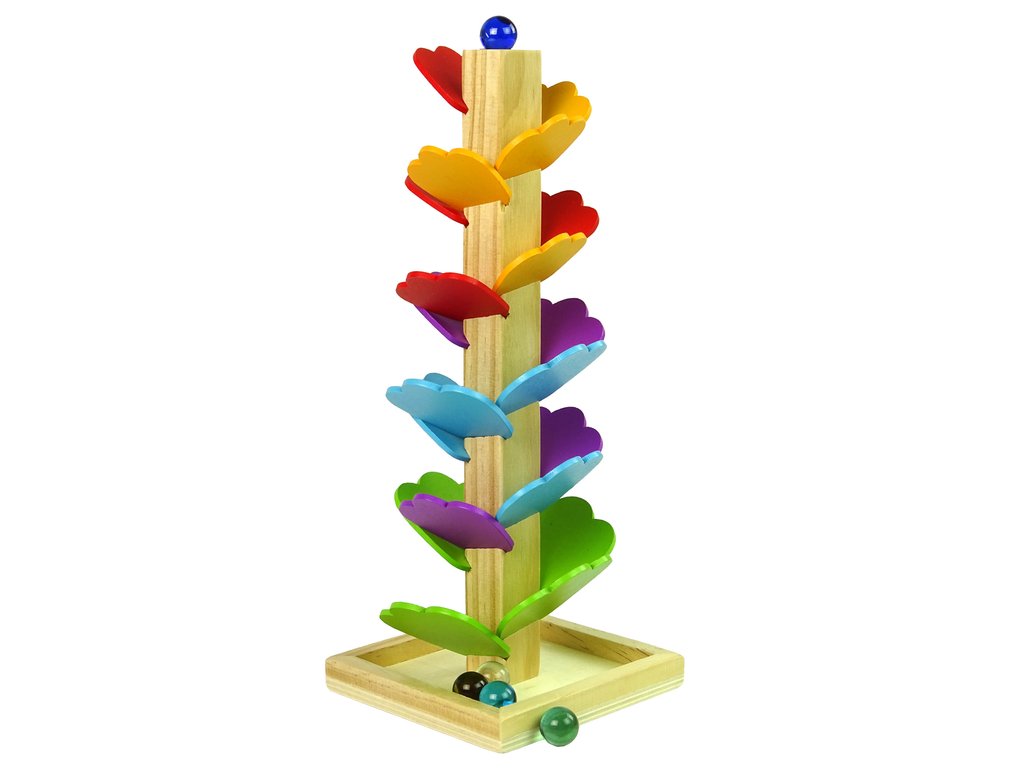 Ta lesena kroglično dirkalna steza drevo ponuja resnično zvočno doživetje. Ko se steklena kroglica postavi na leseno stezo, je mogoče postopoma slišati različne zvoke, saj med potovanjem navzdol pada na različno velike lesene liste, ki ustvarjajo različne zvoke. Zvok postaja od zgoraj navzdol vse glasnejši.
