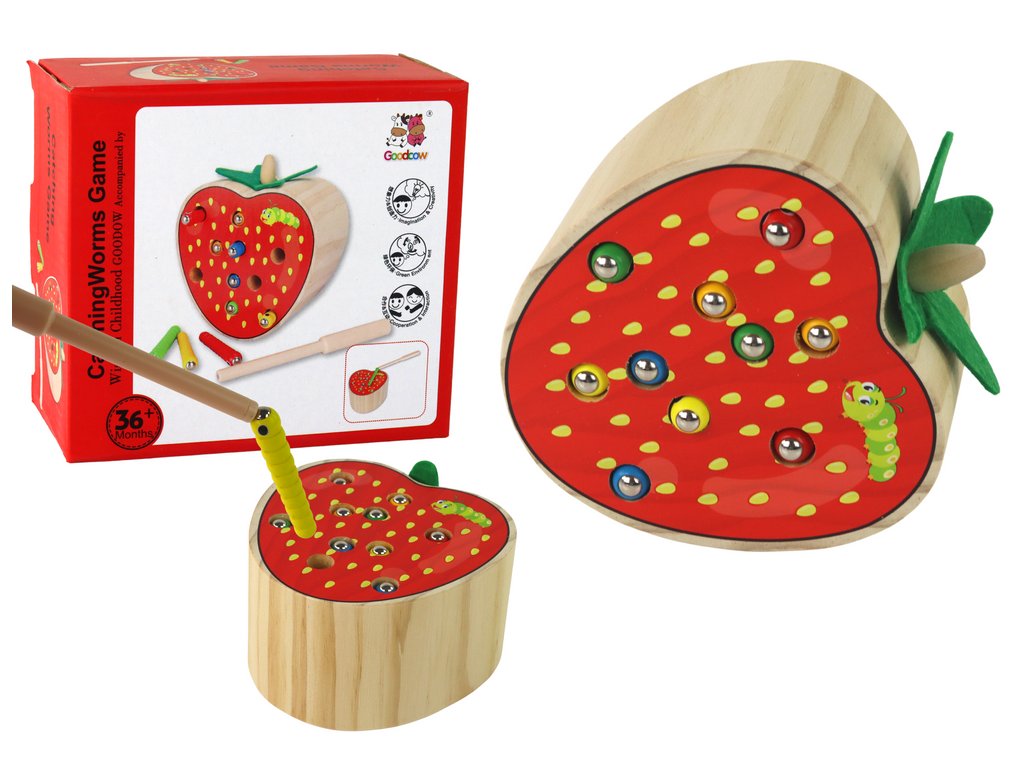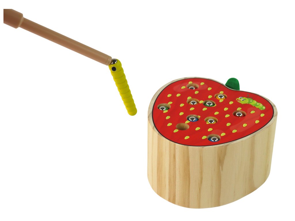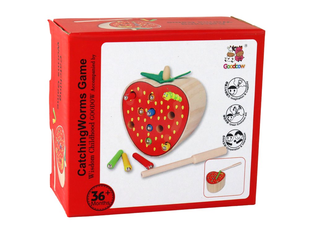 Igra se osredotoča na fascinantno nalogo lovljenja ljubkih črvov z leseno palico z magnetom, ki so spretno skriti v slikovite luknje v leseni jagodi. Nato ima otrok nalogo, da jih natančno postavi nazaj. Ta izziv ne le razvija koncentracijo, ampak tudi izboljšuje ročne spretnosti, motorično koordinacijo in motorične sposobnosti.