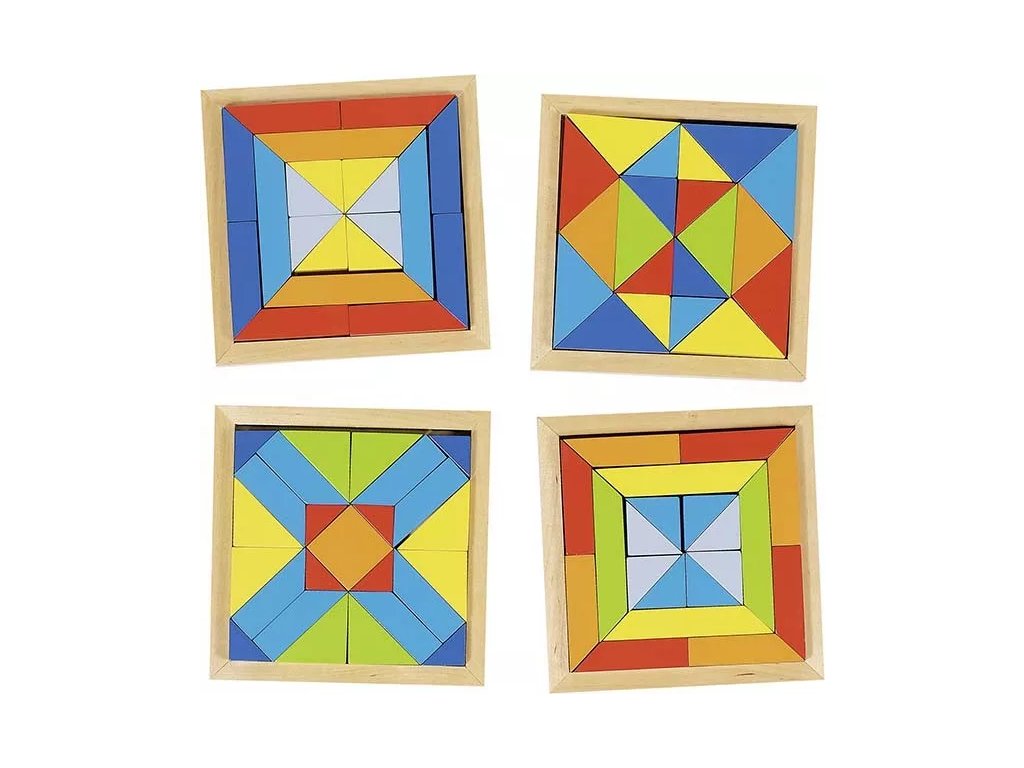 Leseni mozaik je sestavljen iz različnih geometrijskih oblik v raznolikih barvah, shranjenih v lesenem okvirju. Igra ponuja več možnosti uporabe in spodbuja domišljijo ter logično razmišljanje.