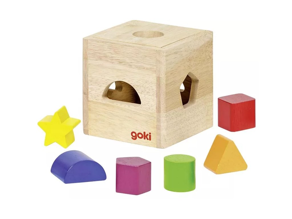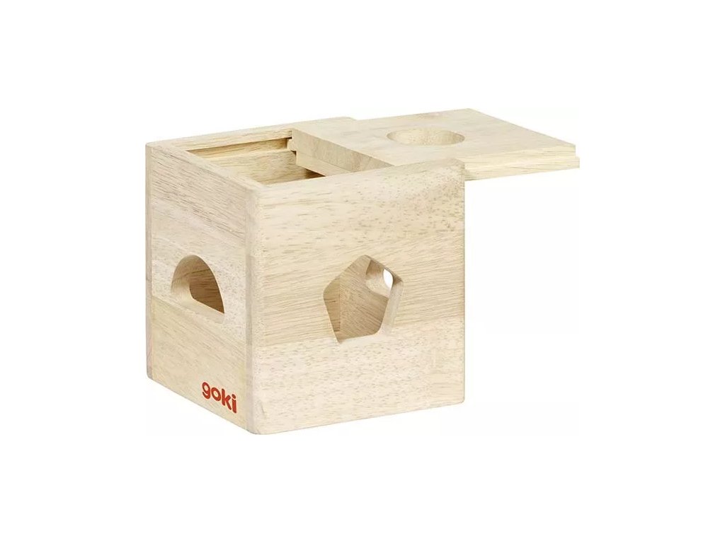 Vsaka stranica kocke ima odprtino za drug del; otrok tako razvršča oblike v pravilne odprtine in se uči prepoznavati osnovne barve. Kocka ima praktičen izvlečni pokrov, ki omogoča enostavno shranjevanje delov.