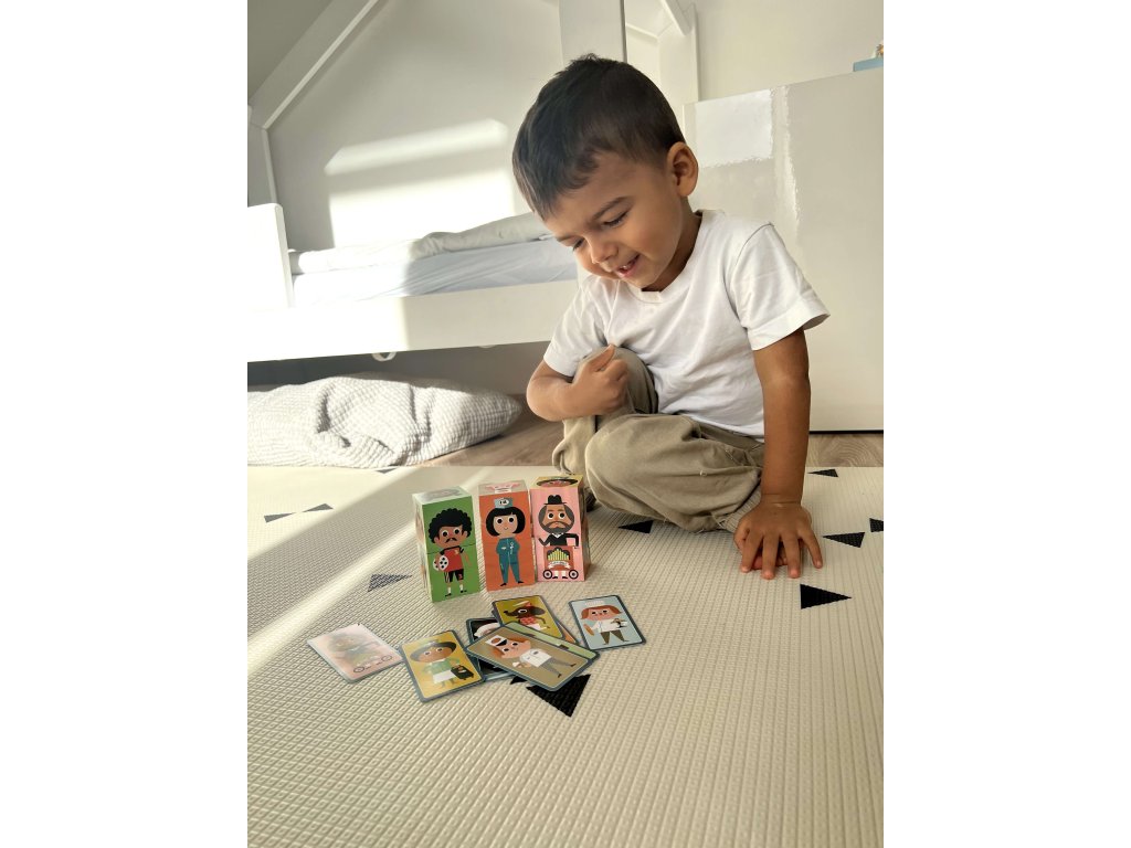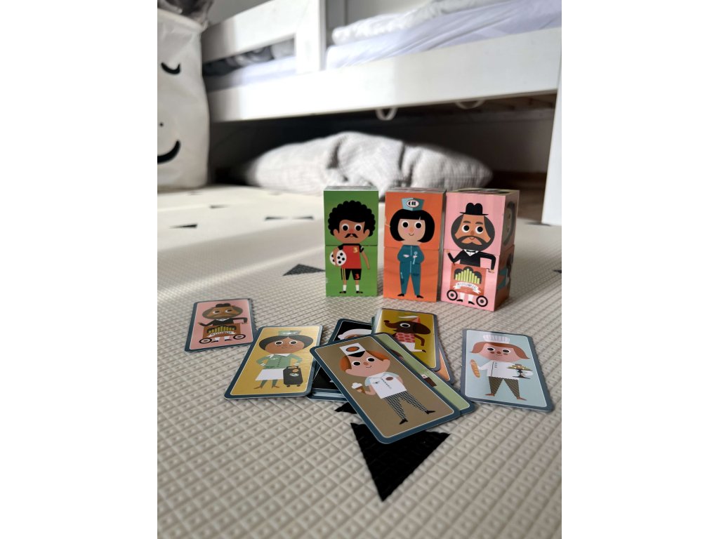 Lesene kocke pri otrocih spodbujajo logično mišljenje, domišljijo in osredotočenost. V kompletu je 9 dvostranskih kart in 6 lesenih kock.