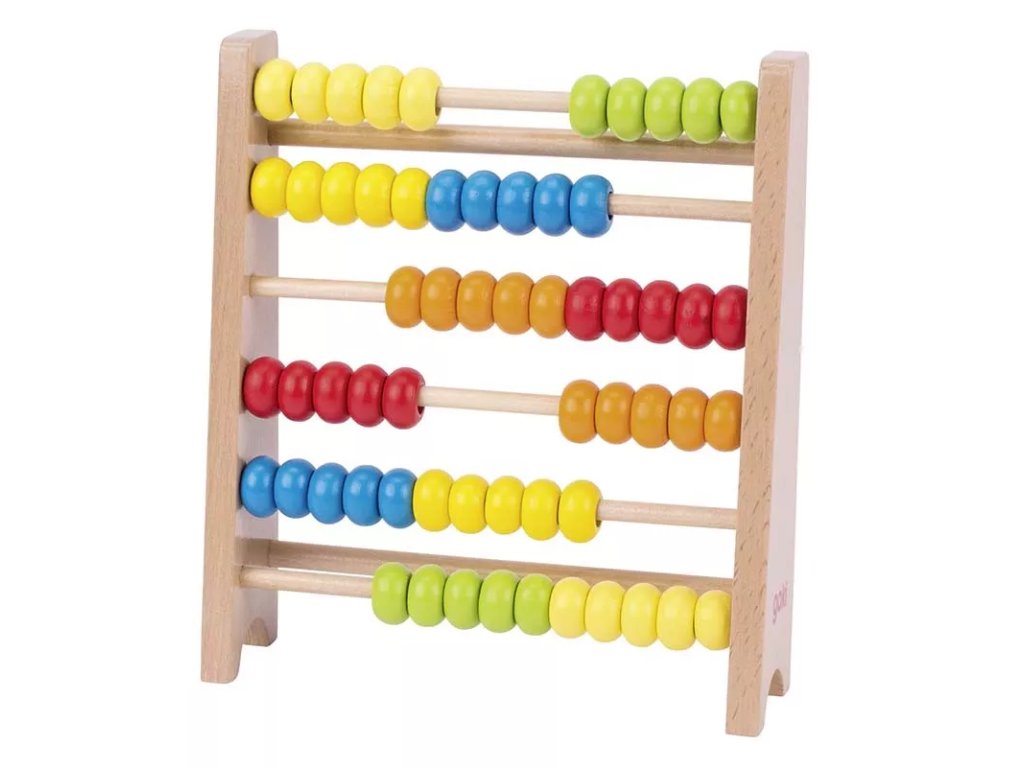 Računalo, izdelano iz lesa s šestimi barvnimi obročki, namenjeno vadbi štetja in fine motorike.