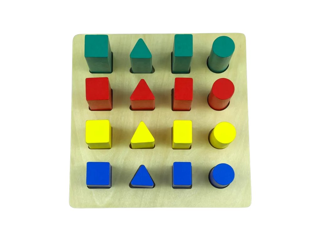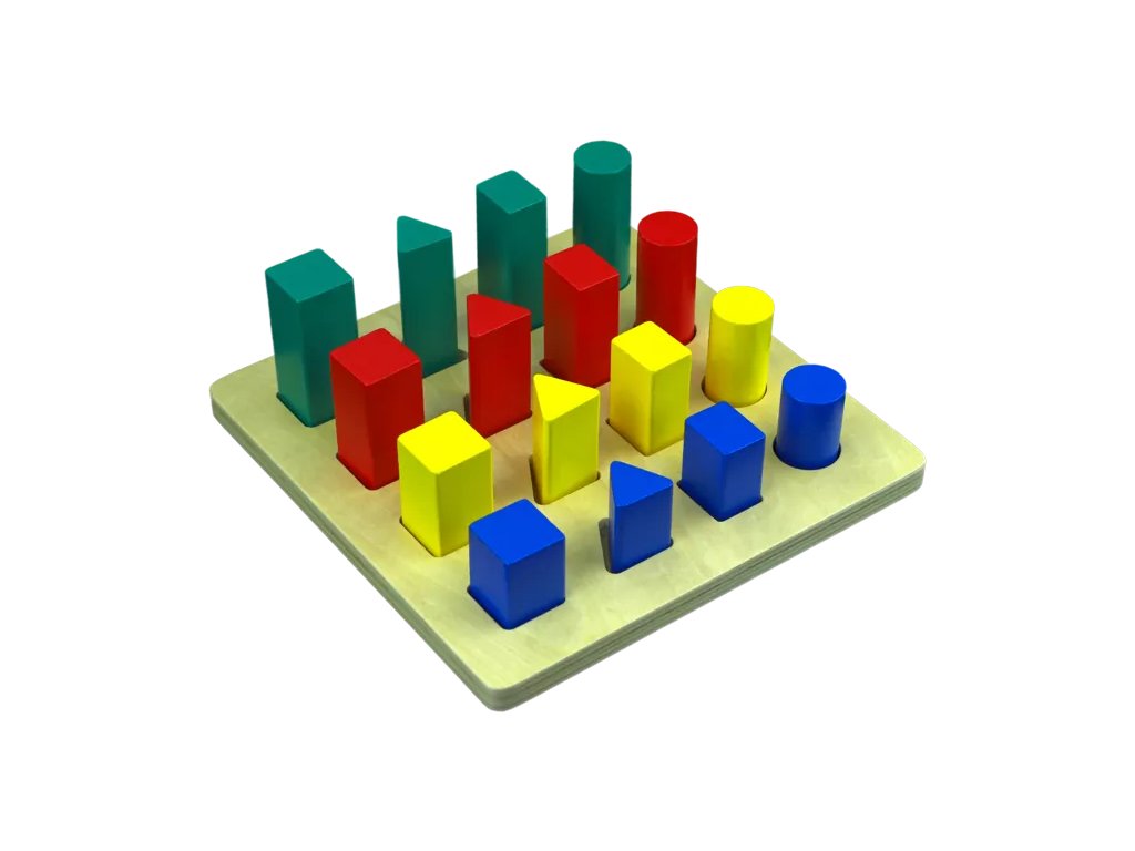 Pripomoček, namenjen razvoju zaznavanja geometrijskih oblik, barv in višin. Otrok se s pomočjo igre posredno pripravlja na razumevanje vsebine in prostornine.