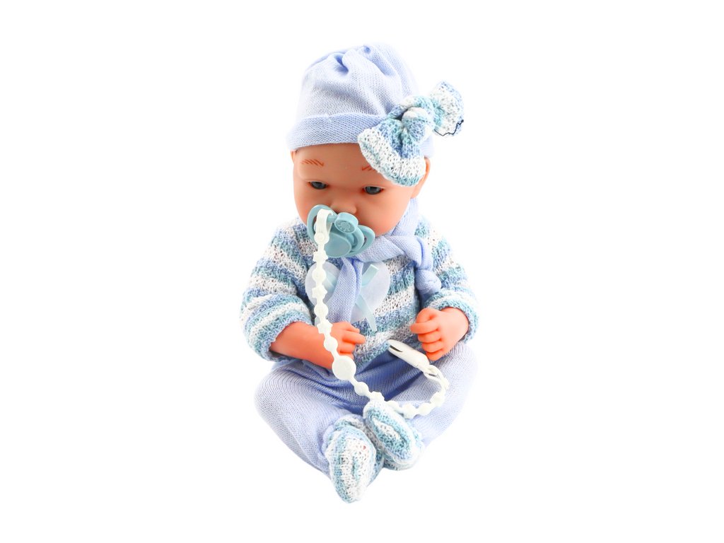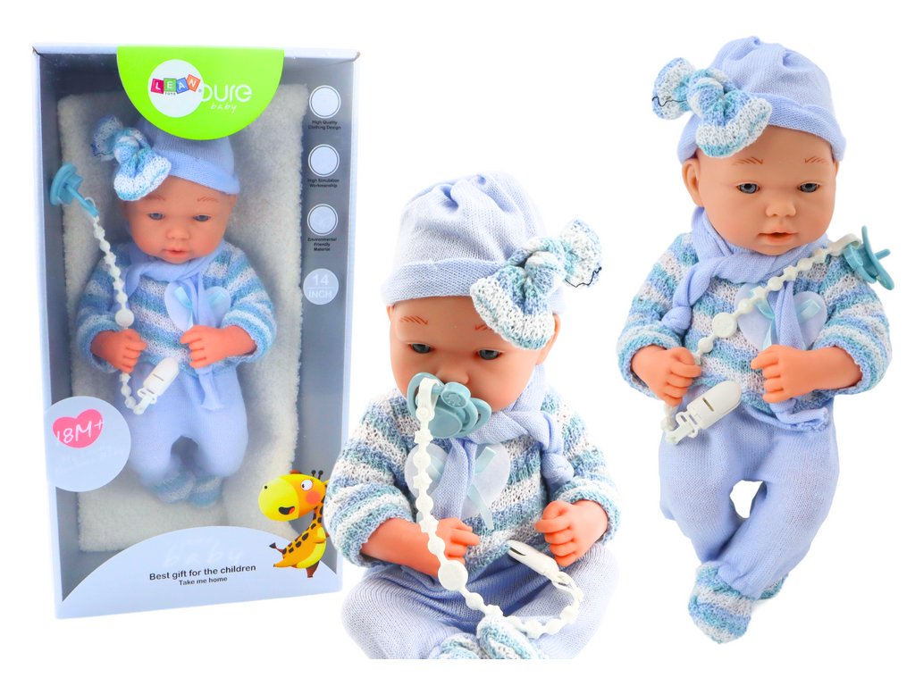 Lutka dojenček v modri obleki je popolna spremljevalka za vsako malo negovalko. Njena ljubka pulover z belimi in modrimi črtami, kapica in šal ji dajejo šarm. Ima gibljive roke in noge, ki jih je mogoče zlahka prestaviti in nastaviti v različne položaje, kar dodaja realizem in omogoča interakcijo med igro.
