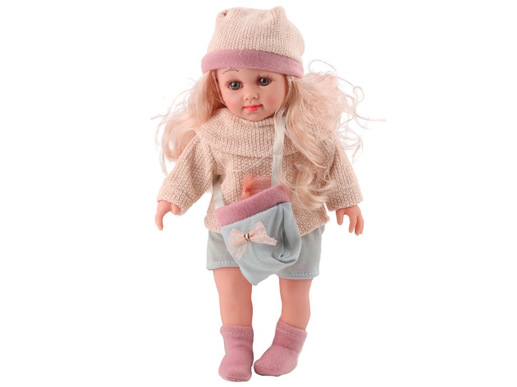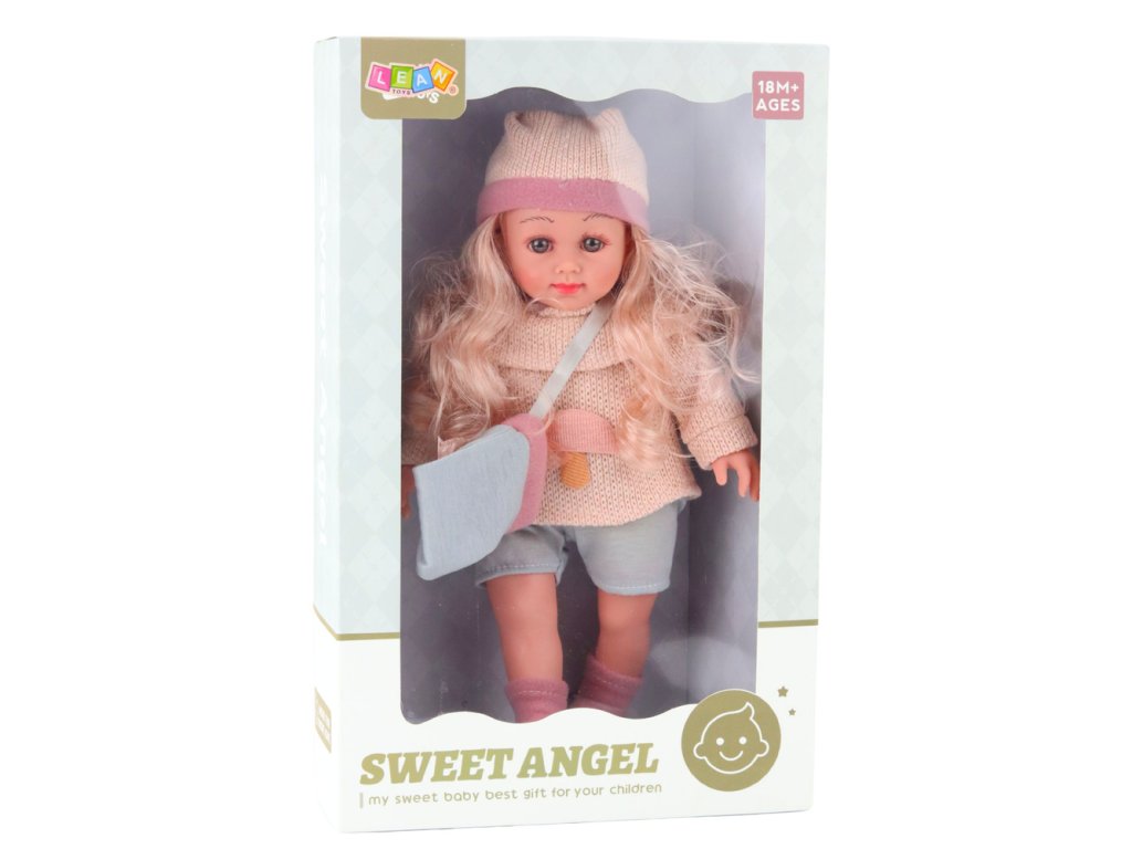 Lutka Sweet Angel v volnenem puloverju z gobico in torbico 36 cm