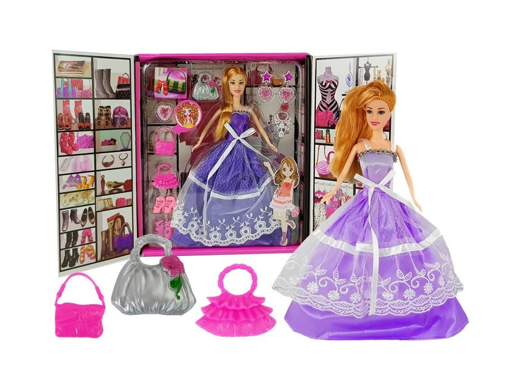 Lepa svetlolasa lutka v vijoličastih čipkastih oblačilih. Poljubno lahko kombinirate z dodatki, kot so torbice, čevlji ali nakit.