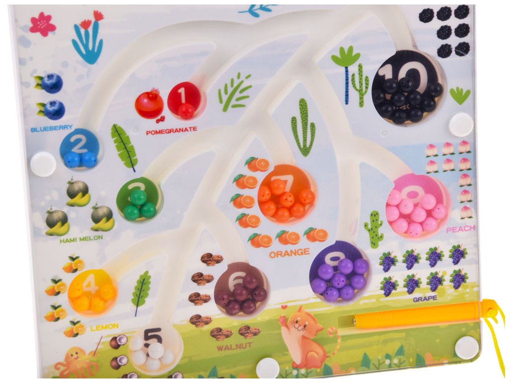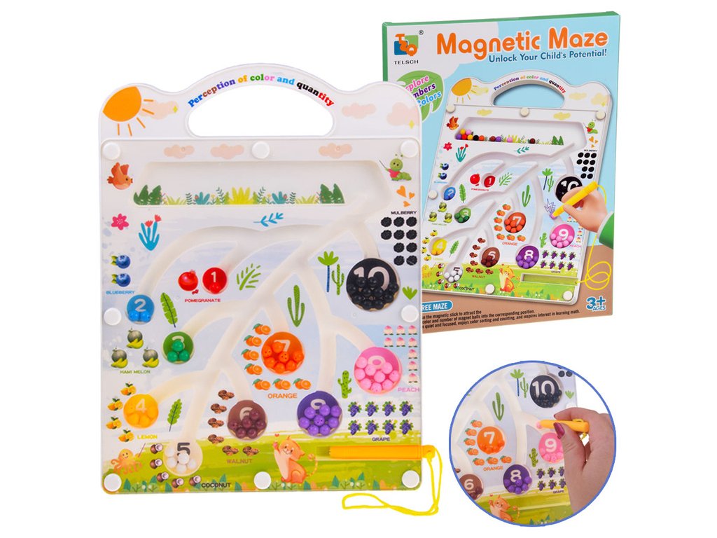 Magnetická tabule s bludištěm je interaktivní hračka, která podporuje rozvoj dítěte prostřednictvím hry. Tabule je vyrobena z plastu v příjemných barvách. Zajímavá, dětem přátelská grafika vybízí k hraní. Velkou výhodou je, že všechny pohyblivé prvky jsou za průhledným sklem, takže se nemusíme bát, že se kuličky během hry ztratí.