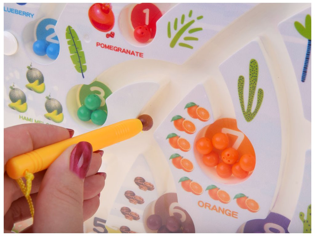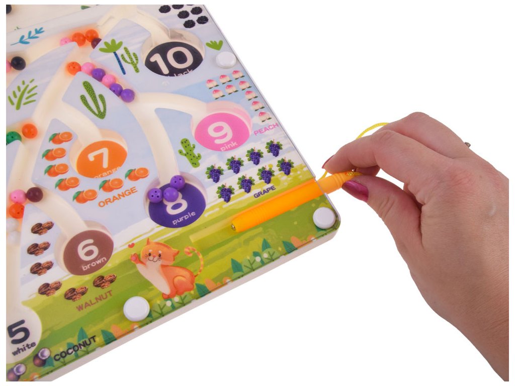 Úkolem dítěte je pomocí speciálního magnetického pera provést kuličky do příslušných otvorů.