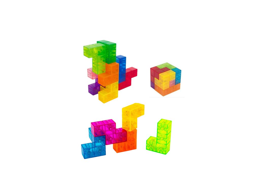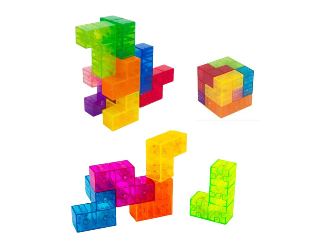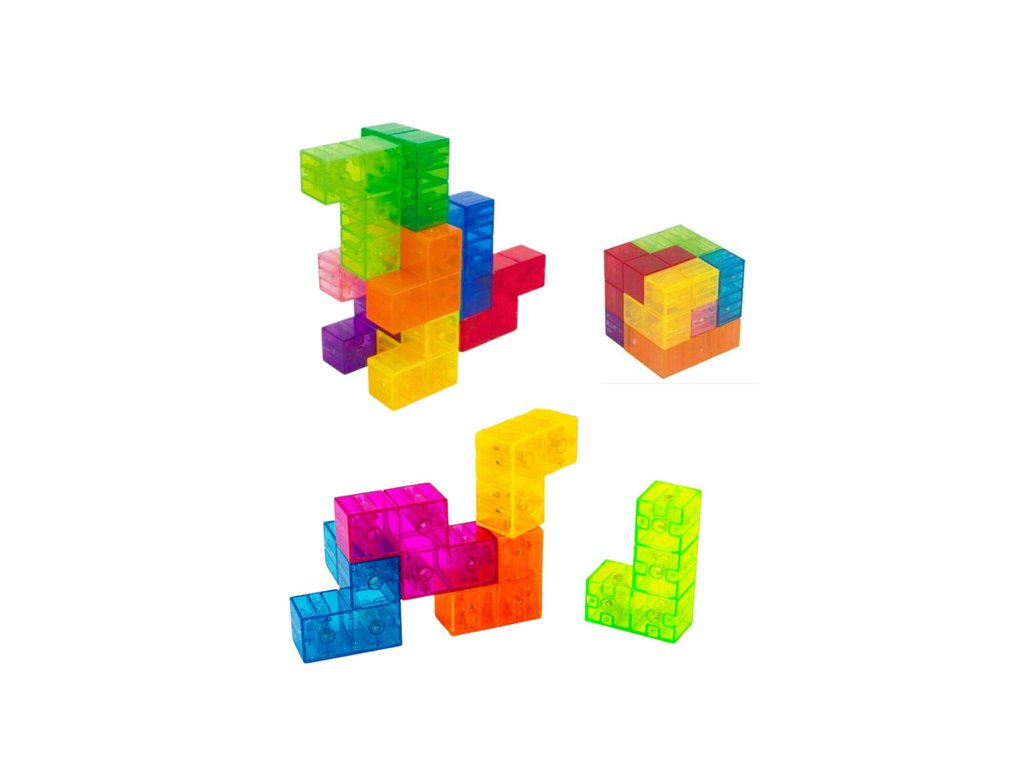 Prozorni barvni kosi so trdno izdelani in trpežni, vgrajeni magneti pa zagotavljajo močno povezavo struktur. S temi kockami lahko ustvarite dvodimenzionalne in tridimenzionalne modele, s čimer razvijate domišljijo in ročno spretnost.