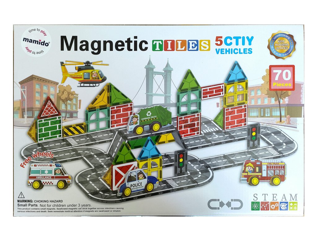 Spodbujajte otroško ustvarjalnost in domišljijo s to barvito magnetno konstrukcijsko igračo, ki vključuje 70 delov za gradnjo mesta, polnega cest, hiš in vozil. Zaradi enostavnega povezovanja magnetnih kock lahko otroci enostavno ustvarjajo zgradbe, mostove in celotne prometne prizore.