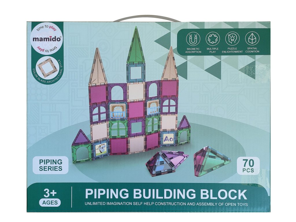 Zgradite svoj grad, stolpe ali barvite hiše z magnetnim gradbenim kompletom s 70 deli. Zahvaljujoč močnim magnetom se deli enostavno povezujejo in trdno držijo skupaj, tako da so konstrukcije stabilne in odporne tudi med igro.