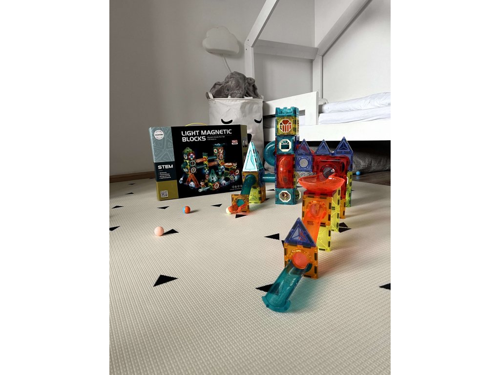 Magnetne kocke so odlična izobraževalna igrača, ki spodbuja otroško ustvarjalnost, uči potrpežljivosti in osredotočenosti. V brošuri, ki je del kompleta, so prikazani primeri steze. Nekateri deli imajo vgrajeno osvetlitev, da igrača deluje domiselno.