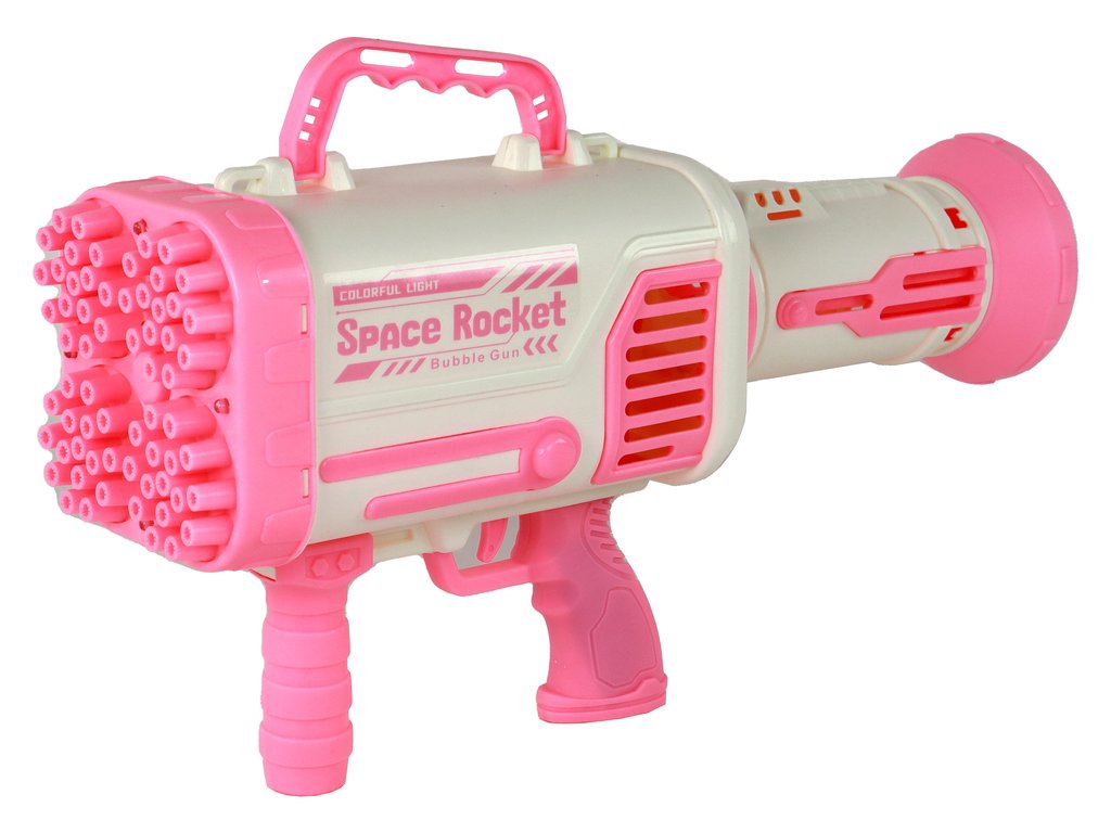 Mehurčki bazuka Vesoljska raketa roza je igrača, ki bo navdušila vsakega otroka – tako fante kot dekleta. Igra z njo vam omogoča občudovati mavrične milne mehurčke, ki se dvigajo v zrak in se čudovito svetlikajo v različnih barvah. Zmore jih ustvariti na desetine! Dizajn predstavljene igrače združuje zasnovo, značilno za velika orožja, celo avtomatska orožja. Kot vidite, se fantastično združuje v celoto in spreminja običajen stroj za izdelavo milnih mehurčkov v izvirno in nenavadno igračo.