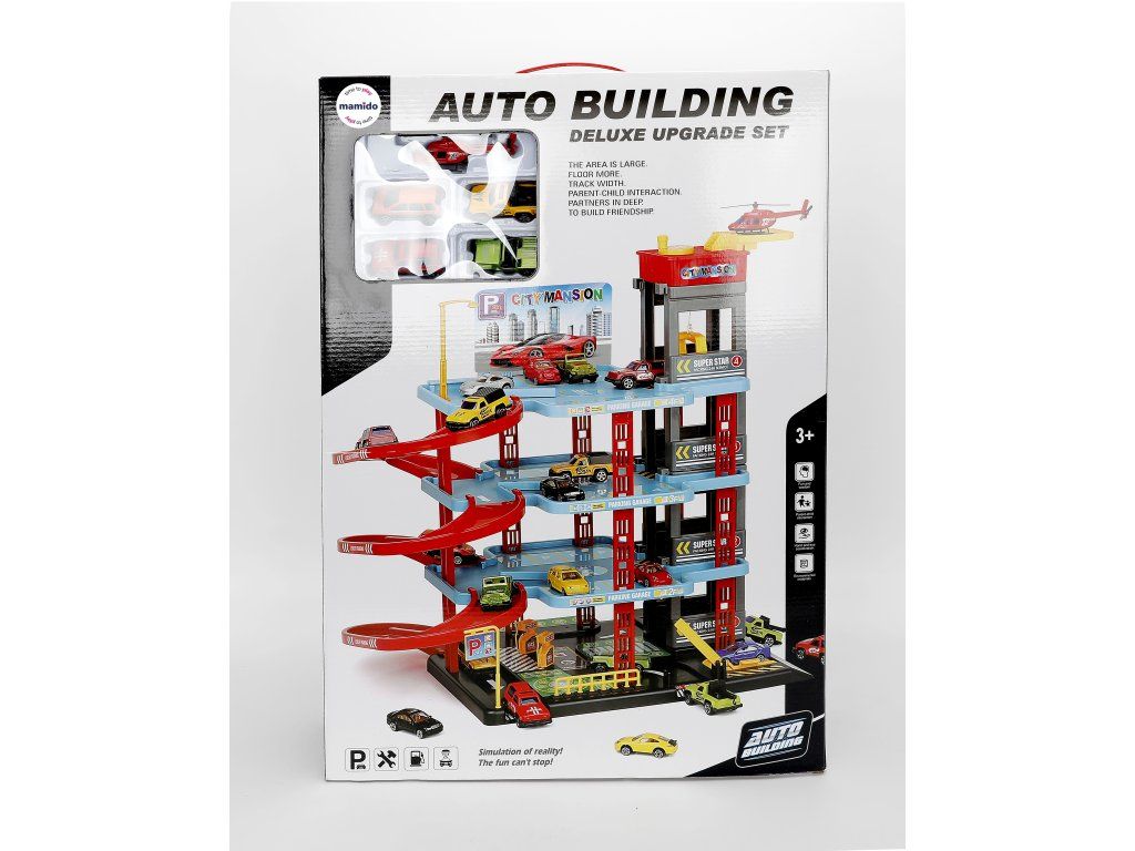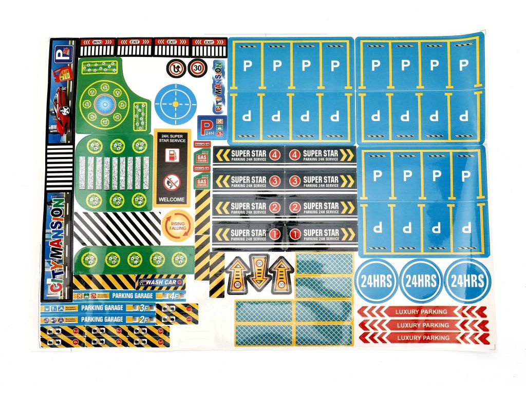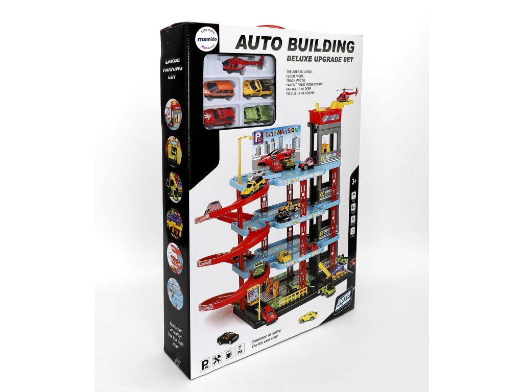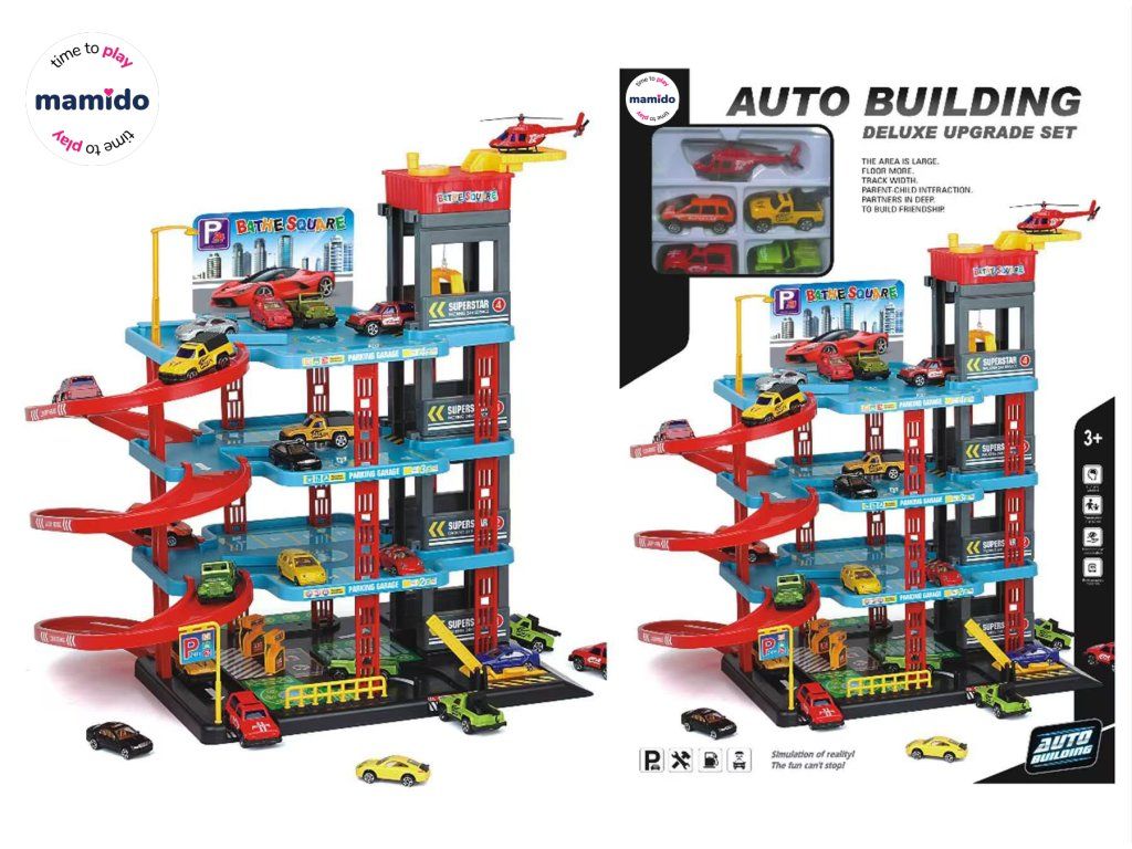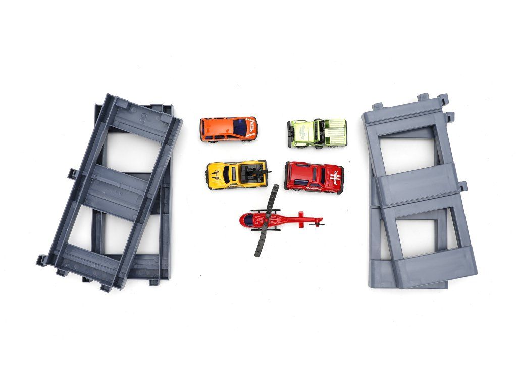 Zahvaljujoč bogati opremi s 6 kovinskimi avtomobilčki, helikopterjem in nalepkami si lahko otroci postavijo lastno mestno parkirišče in uživajo v realistični igri, polni domišljije. Prednost so tudi premični dvigali in spusti, ki igri dodajajo dinamiko in zabavo.