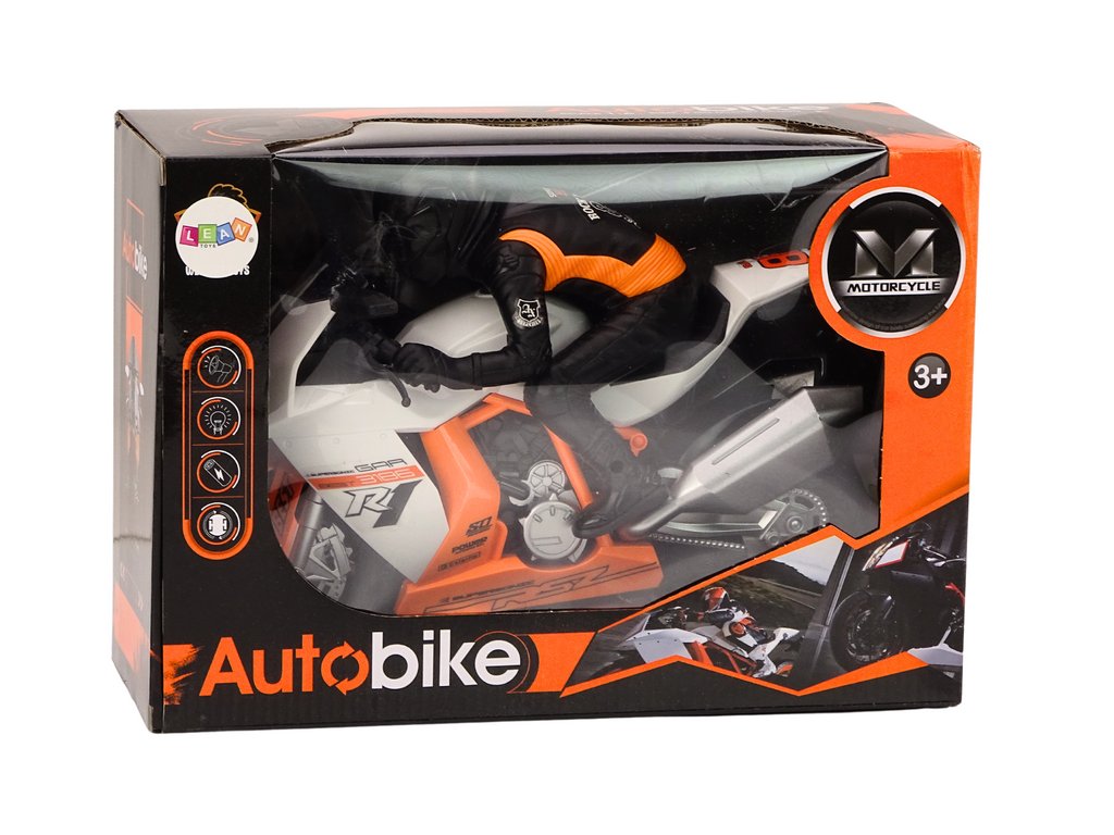 Beli motor z motoristom je dinamična igrača, izdelana iz trpežnih materialov, ki zagotavljajo dolgotrajnost in realističen videz. Vsak element je skrbno izdelan z veliko pozornostjo do detajlov, kar dodaja avtentičnost in omogoča, da motor izgleda kot pravi. Njegova bela barva z oranžnimi elementi pritegne pozornost in mu daje moderen ter energičen značaj. Figurica motorista je natančno obdelana in poudarja njegov realističen videz.