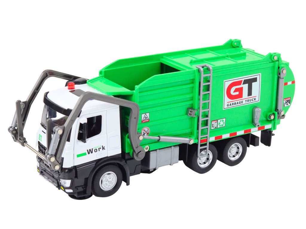 Odkrijte kovinski smetarski tovornjak, ki ne samo čisti, ampak tudi zabava in izobražuje otroke. Narejen je v modernem slogu z zelenim dizajnom, ki mu doda čar. Vztrajnik omogoča enostavno gibanje, v kompletu pa najdete barvne zabojnike za smeti in papirnate izrezanke. Idealna igrača za otroško sobo. Trdna kovinska konstrukcija zagotavlja trajnost in odpornost, interaktivno učenje o ločevanju odpadkov pa dela to vozilo odlično darilo za male ljubitelje strojev.