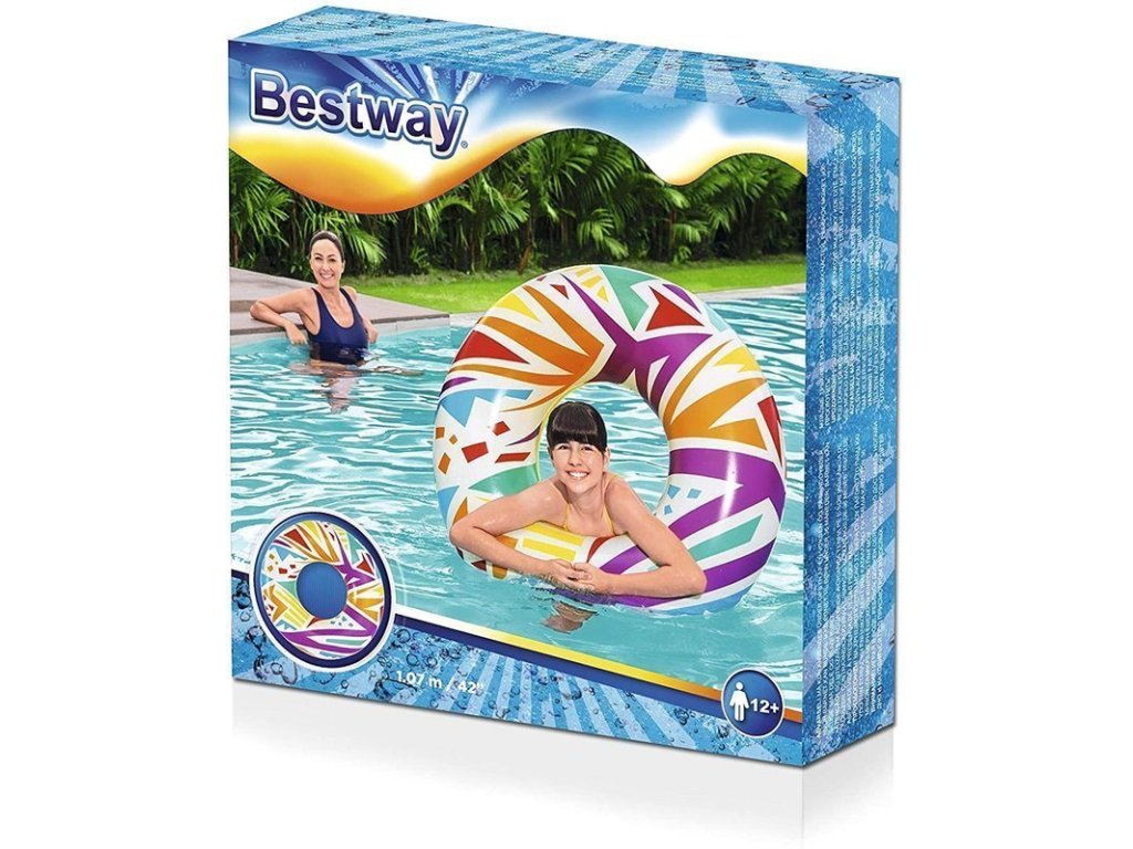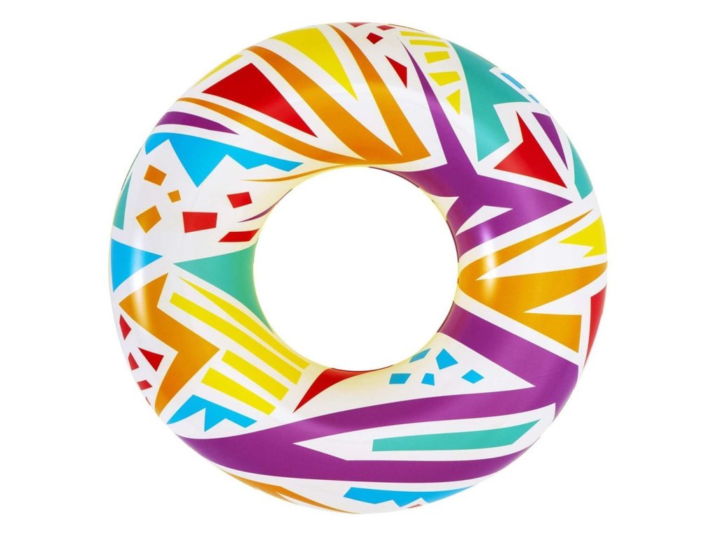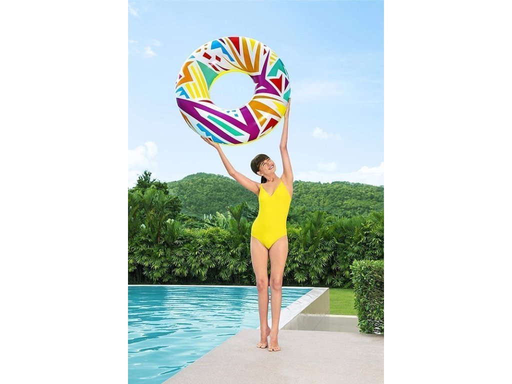 Barvni obroč bo zagotovo pritegnil pozornost mnogih ljubiteljev sončenja. Obroč je namenjen otrokom od 12 let in vsem odraslim. Njegov premer je 107 cm. Obroč je udoben in stabilen na vodi. Izdelan je iz trpežnega PVC materiala, ki je odporen proti poškodbam in sončni svetlobi.