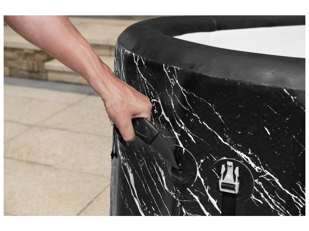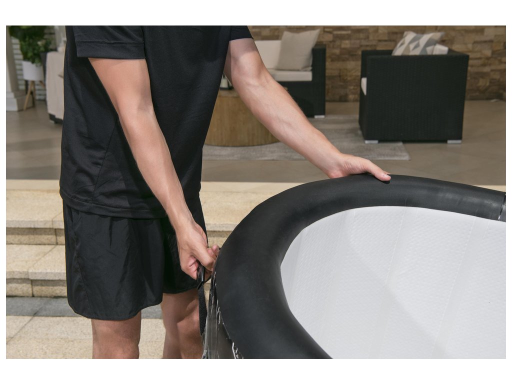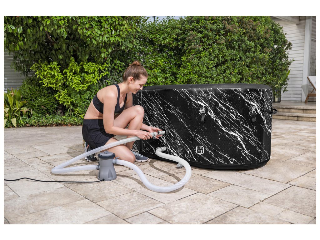 Zdaj lahko te prednosti uživate v udobju svojega vrta, terase ali domačega sprostitvenega prostora. Intuitivna in hitra namestitev – ročno črpanje traja le nekaj minut, visokozmogljiv filtracijski sistem pa ohranja vodo čisto za higiensko in udobno uporabo. Paket vključuje tudi ojačan varnostni pokrov, torbo za prenašanje in potrebno opremo za enostavno shranjevanje in transport.