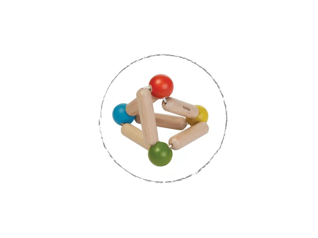 Prožno oblikovalsko ropotuljico v obliki piramide je mogoče prosto upogibati in se dobro prilega majhni otroški roki. Na sredini ropotuljice je lesena kroglica, ki oddaja zvok v dveh tonih.