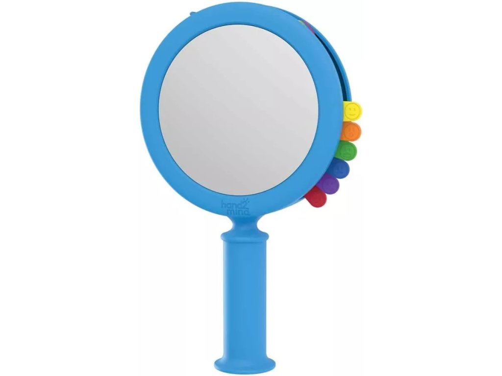To varno ogledalo vsebuje 6 vstavljenih fotografij resničnih otrok, ki izražajo različna čustva. Posamezna ogledala imajo živahne barve in robusten ročaj, ki ga je enostavno prijeti.