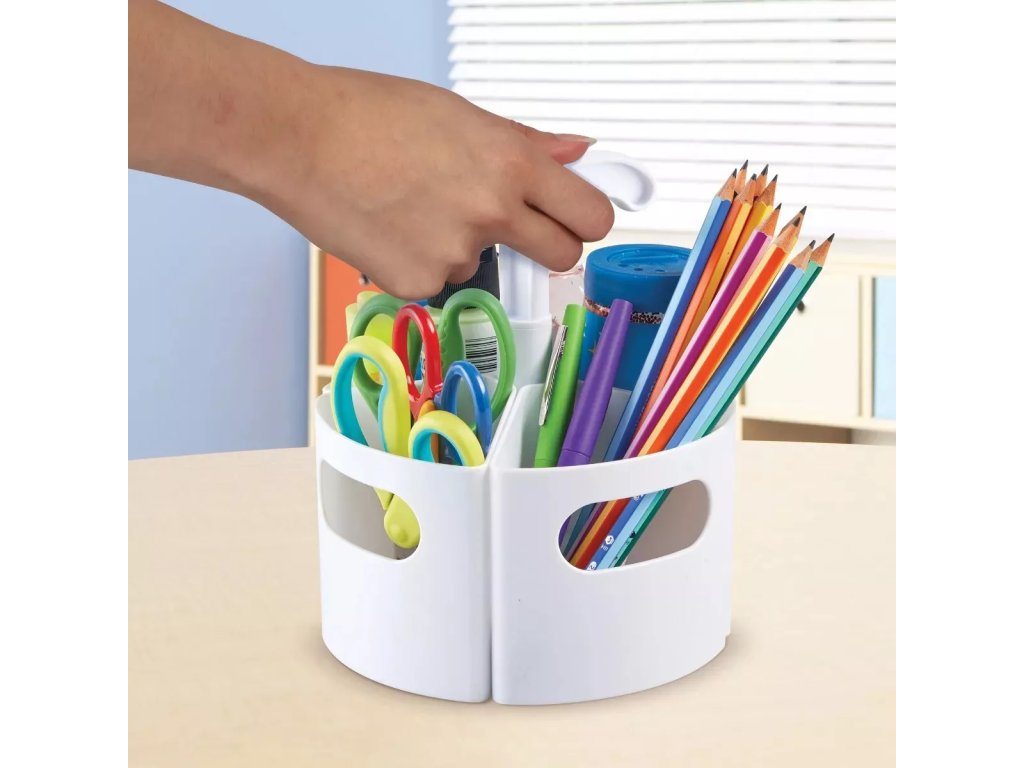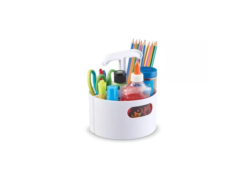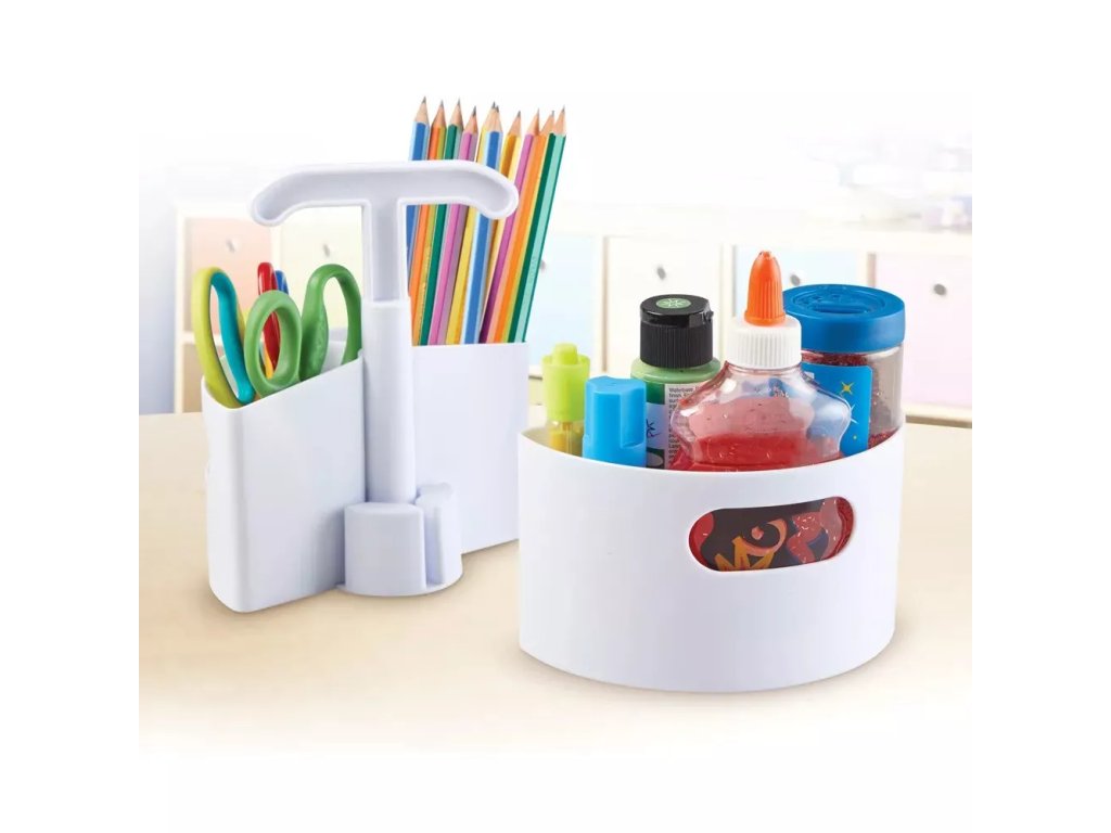 Enostavno prenosljiv organizator je primeren za uporabo doma in v razredu. Na priročen ročaj se prilegajo trije odstranljivi prostori za shranjevanje, namenjeni pisalnim in likovnim pripomočkom. Zahvaljujoč praktični razporeditvi lahko pripomočke hitro razvrstite in prenesete tja, kjer so potrebni.