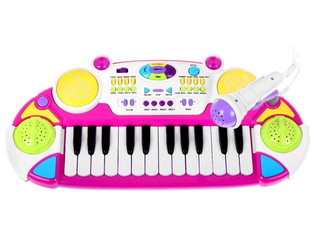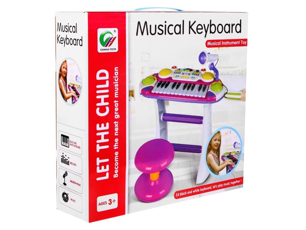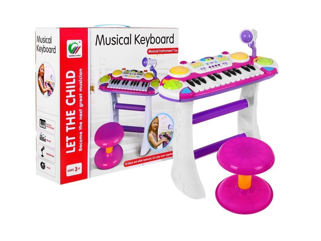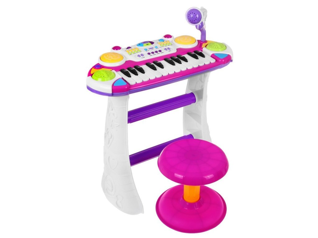 Otroška klaviatura roza s stolom je odlična alternativa za vse male glasbene navdušence, pa tudi za začetnike. Opremljena je s 14 belimi tipkami in 10 črnimi tipkami. Ima stojalo z mikrofonom in stolček, prilagojen za otroke.