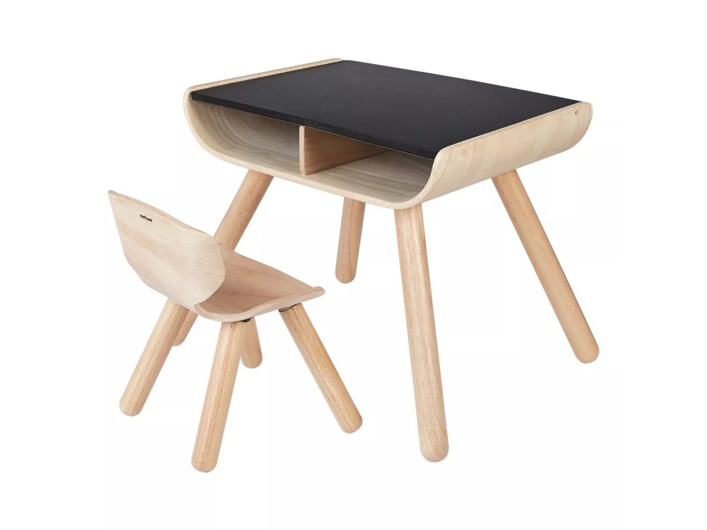Večnamenska mizica z elegantnim dizajnom iz upognjenega lesa je namenjena aktivnim malčkom. Kombinira masiven kavčukov les z zgornjo ploščo iz materiala PlanWood, ki je organsko obarvana s črnim pigmentom in omogoča risanje s kredo.