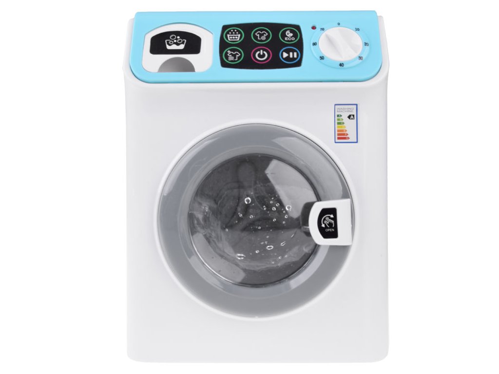 Otroška pralni stroj z zaslonom na dotik in efekti modra je pripomoček, ki ne sme manjkati v nobenem gospodinjstvu. Pralni stroj z odpiralnimi vrati, vrtljivim bobnom, efektom hrupa vode in zvokom pranja.