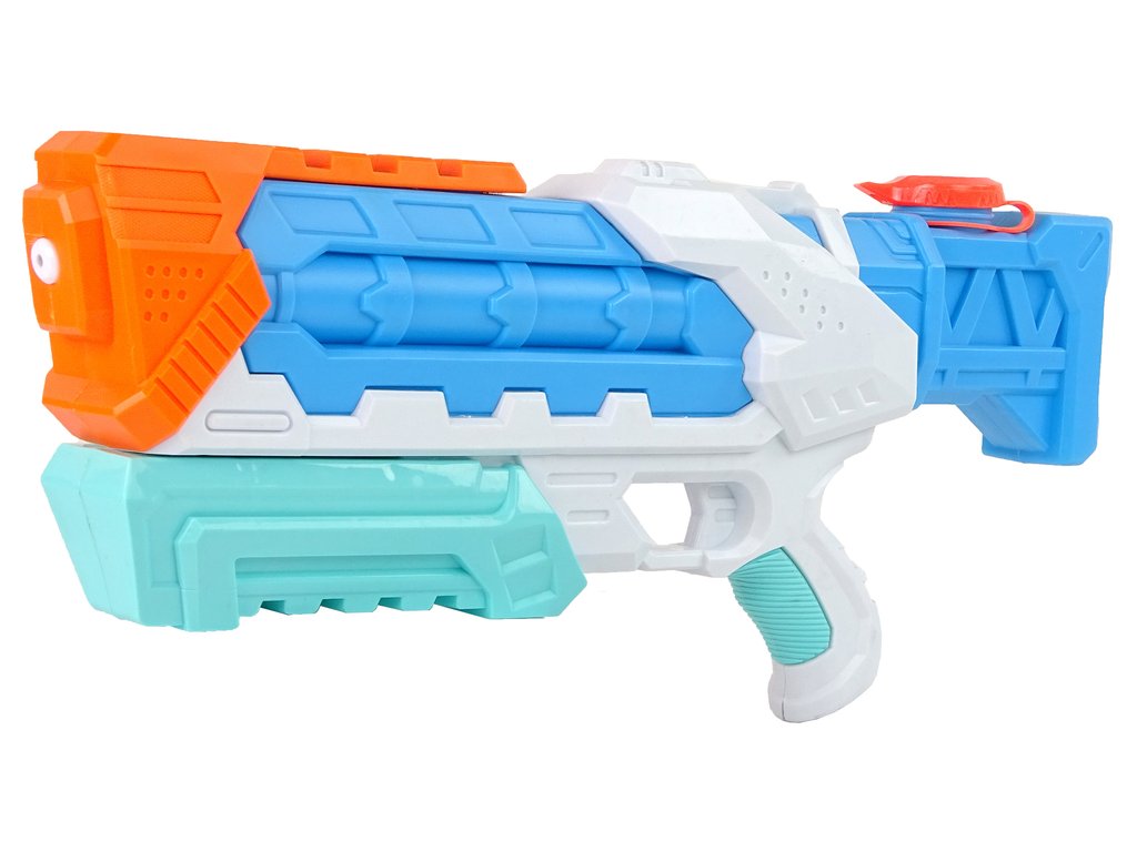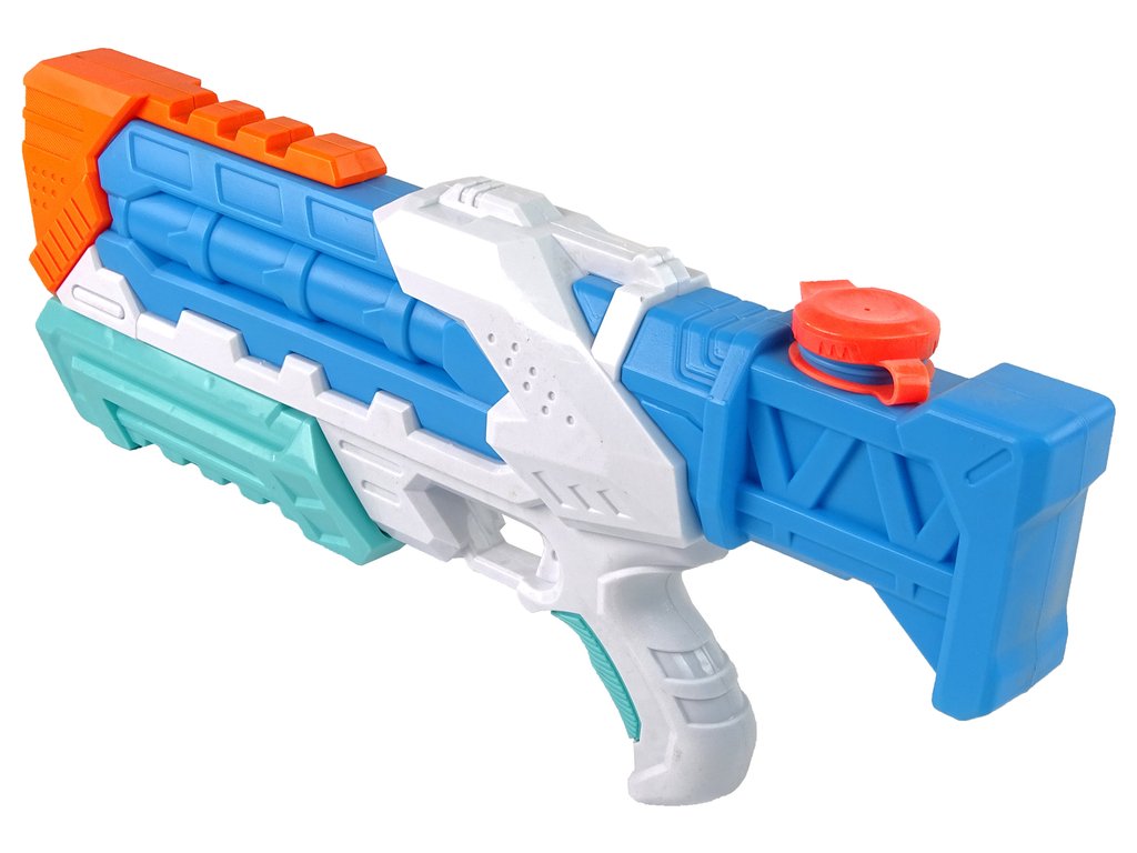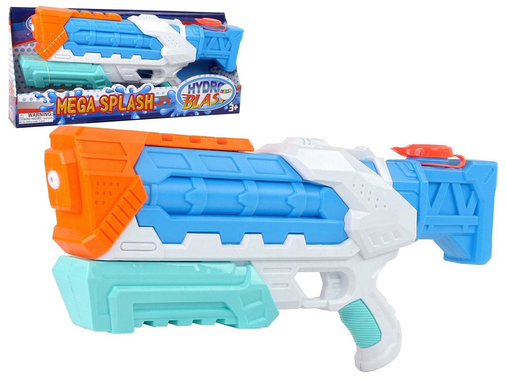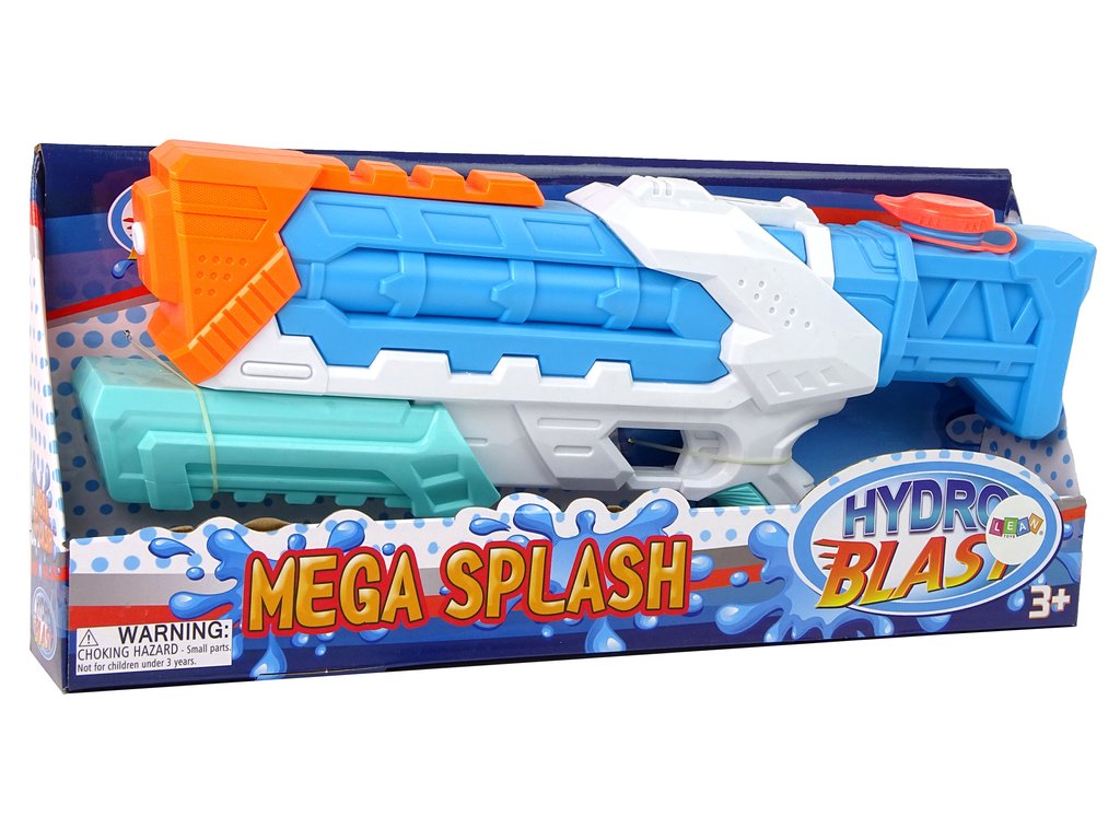 - Predstavljena vodna pištola je modre barve z belimi in oranžnimi elementi. Municija, ki je voda, je varna, zato se lahko brez skrbi podate v boj z družino ali vrstniki.