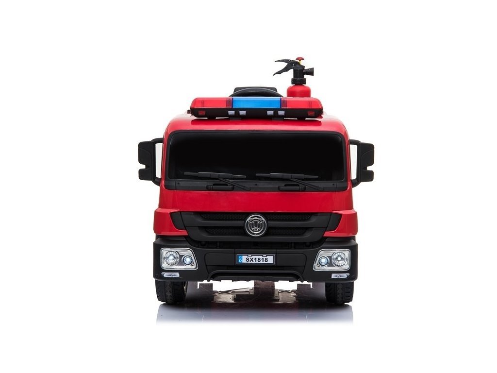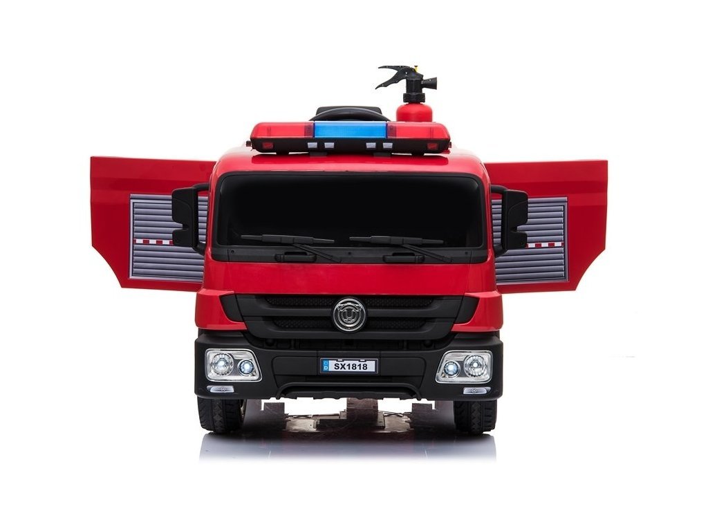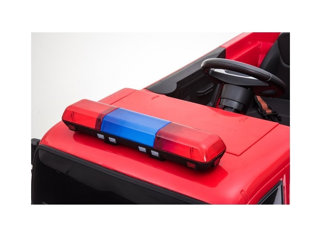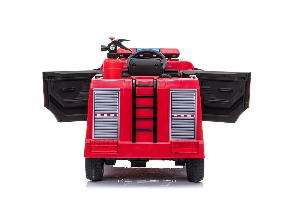 V notranjosti daljinsko vodenega otroškega gasilskega avtomobila je vrtljiv volan s kontrolnim gumbom ter armaturna plošča, ki prikazuje posnetke merilnikov vrtljajev in hitrosti.