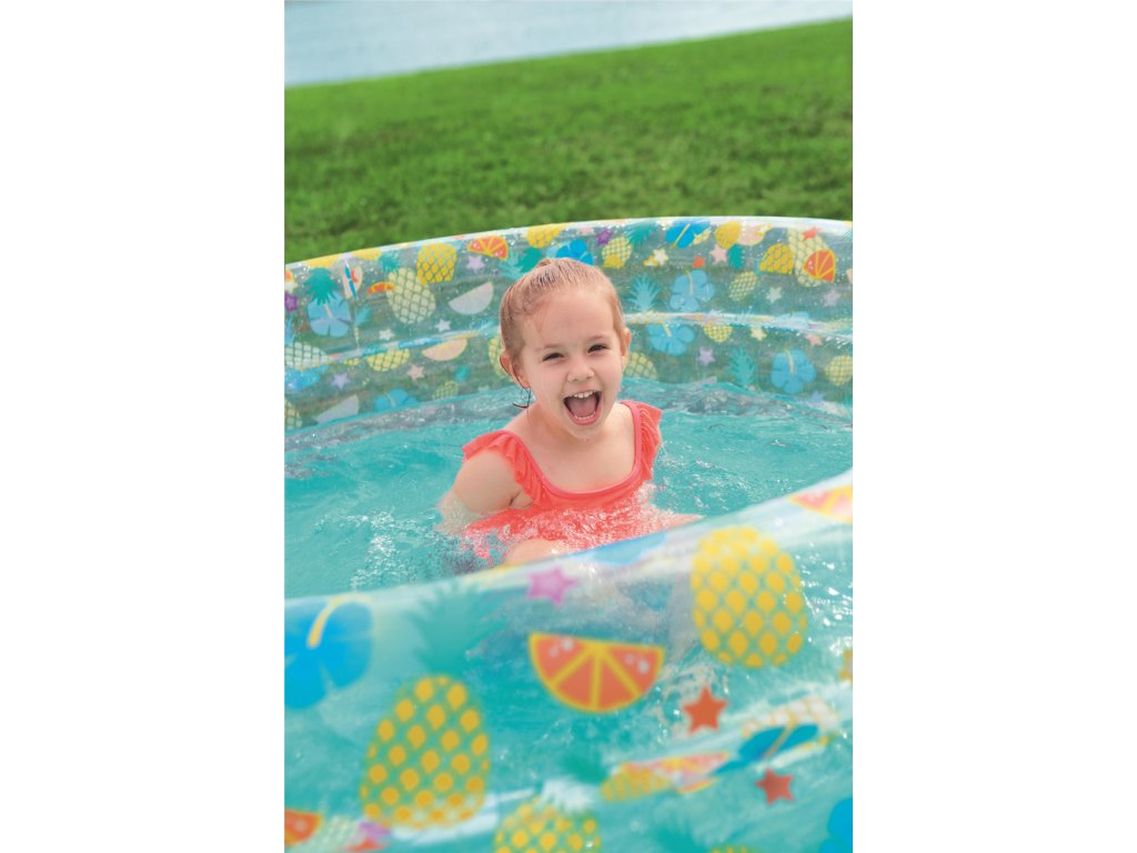 Nafukljiv bazen zagotavlja vašemu otroku gibanje in zabavo v vodi. Zaradi svojih majhnih dimenzij je idealen za otroke od 2 let naprej. Enostavno ga je napihniti in spustiti, kar pomeni, da ne zavzame veliko prostora za shranjevanje.
