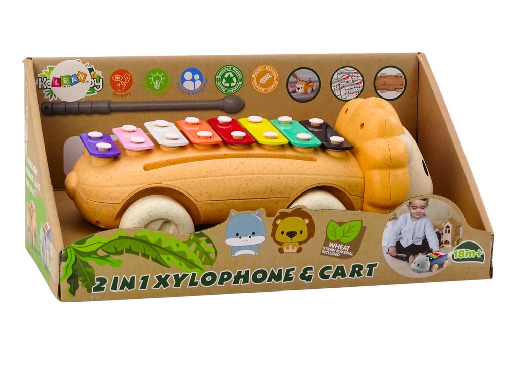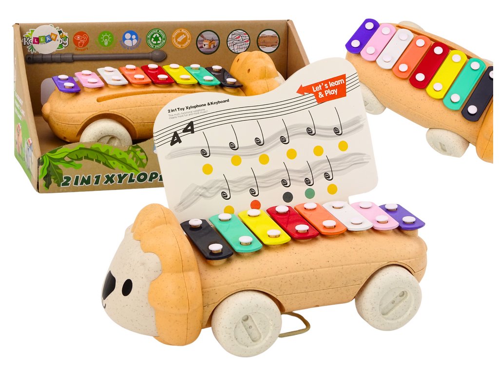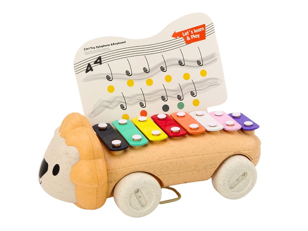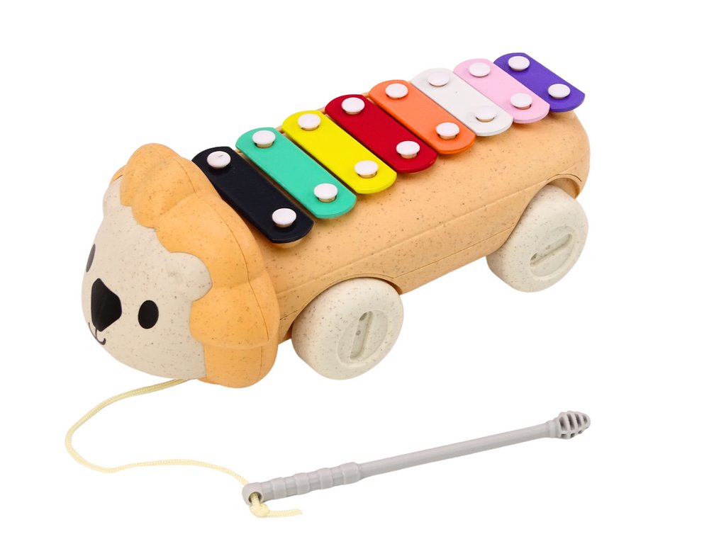Otroški cimbalo na kolesih lev ima osem tipk. Različne barve in zvoki omogočajo otrokom, da se naučijo razlikovati barve in tone, kar spodbuja njihov glasbeni in kognitivni razvoj. Pod cimbalom je priložena palčka.