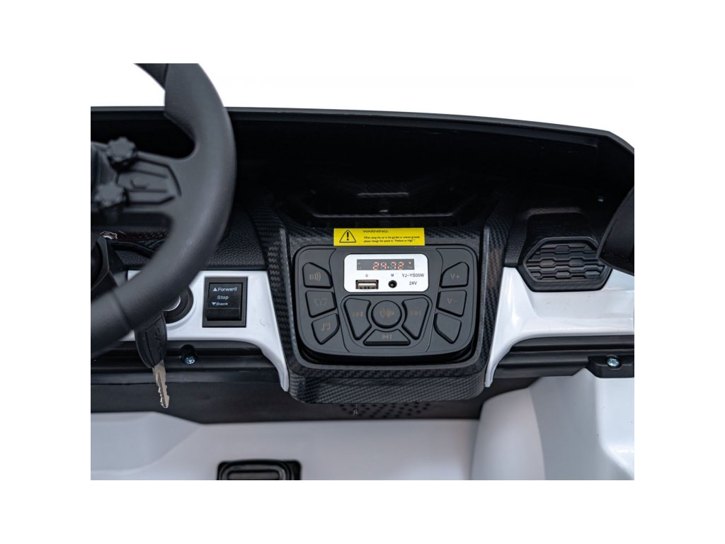 Oprema vključuje bogato multimedijsko ploščo z FM radiem, MP3, USB, AUX in Bluetooth. Starši imajo popoln nadzor zahvaljujoč 2,4 GHz daljinskemu upravljalniku s tremi hitrostmi in varnostnim gumbom STOP.