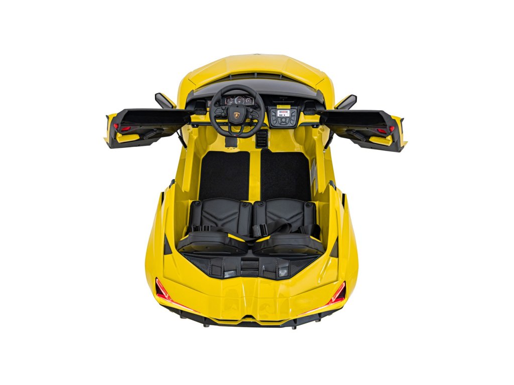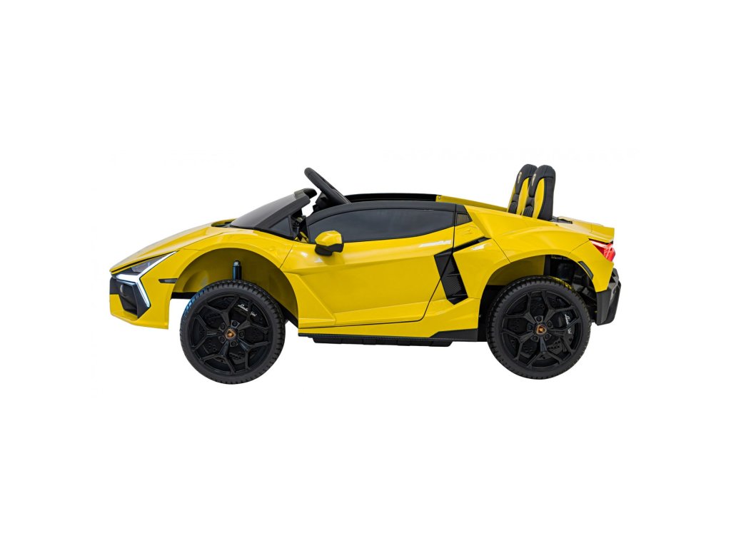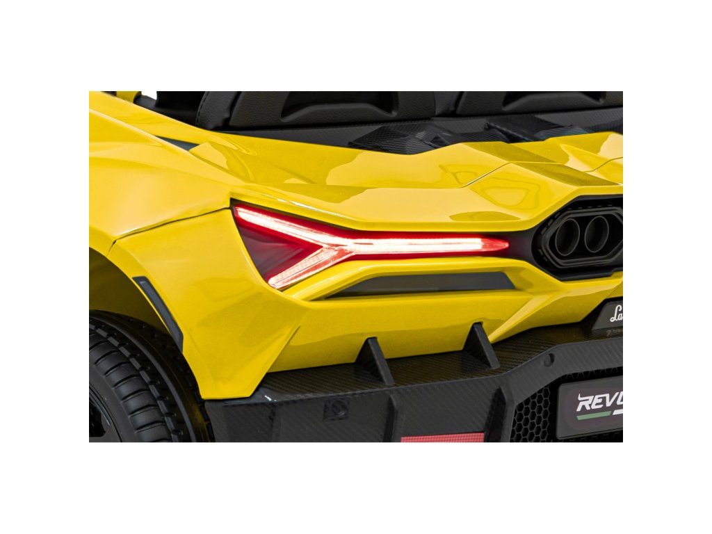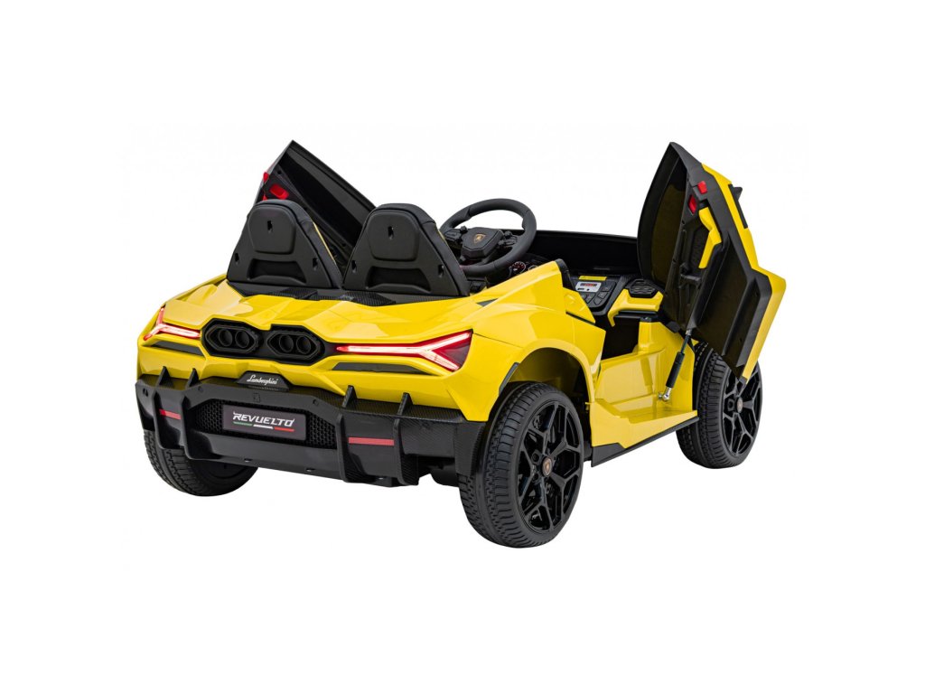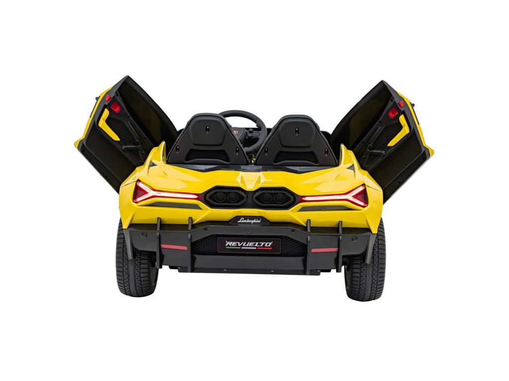 Električni avtomobilček za otroke Lamborghini Revuelto združuje vrhunsko zmogljivost, udobje in slog, zvest originalu. Štirje zmogljivi 200 W motorji, velika kolesa iz pene EVA in zadnje vzmetenje zagotavljajo gladko vožnjo po ravnih površinah in nežnem terenu. Dvojni sedež, prevlečen z eko usnjem , z varnostnimi pasovi, LED osvetlitvijo in odpiralnimi vrati dajejo avtomobilčku realističen videz in varnost.