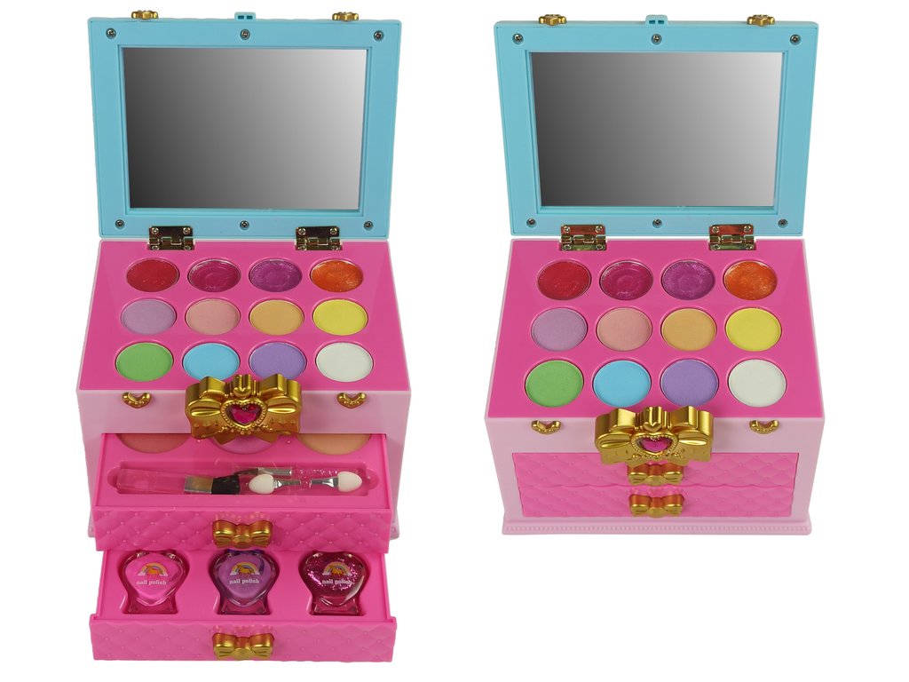 Celoten set je shranjen v čudovitem kovčku, ki je zaprt s sponko z mašnico in diamantnim srčkom. Sam kovček je zelo elegantno in zanimivo zasnovan. Roza in svetlo modra barvna kombinacija se lepo poda v vsak interier, še posebej v otroško sobo. Predali so izvlečni in imajo ročaj v obliki zlate mašnice. Ko odpre etui, bo deklica navdušena nad izbiro barv senčil za oči in sijajev za ustnice. Na pokrovu je ogledalce, zato bo lahko kovček vzela s seboj in se kjerkoli naličila.